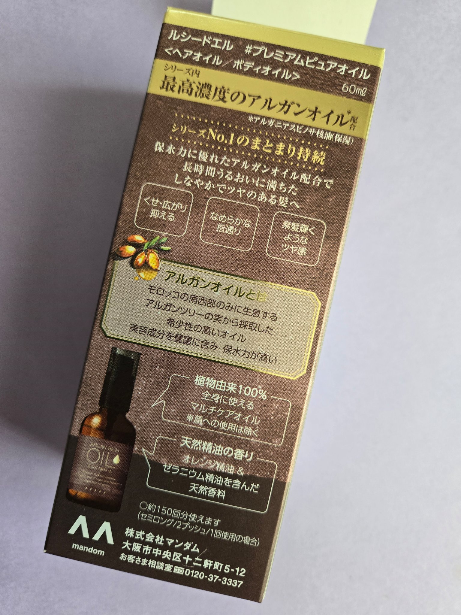 - シリーズ内最高濃度のアルガンオイル*1配合で、髪の広がり・パサつきをおさえ、長時間うるおうのにベタつかない指通りのよい自然な仕上がりのオイルです。植物由来の天然オイル100%で、髪だけではなく肌・頭皮までマルチ*2に使用可能。オレンジ精油&ゼラニウム精油を含んだ天然精油の香りで、無添加処方(鉱物油フリー、シリコーンフリー、着色剤フリー、合成香料フリー、紫外線吸収剤フリー、防腐剤フリー) *1 アルガニアスピノサ核油(保湿) *2 顔への使用は除く