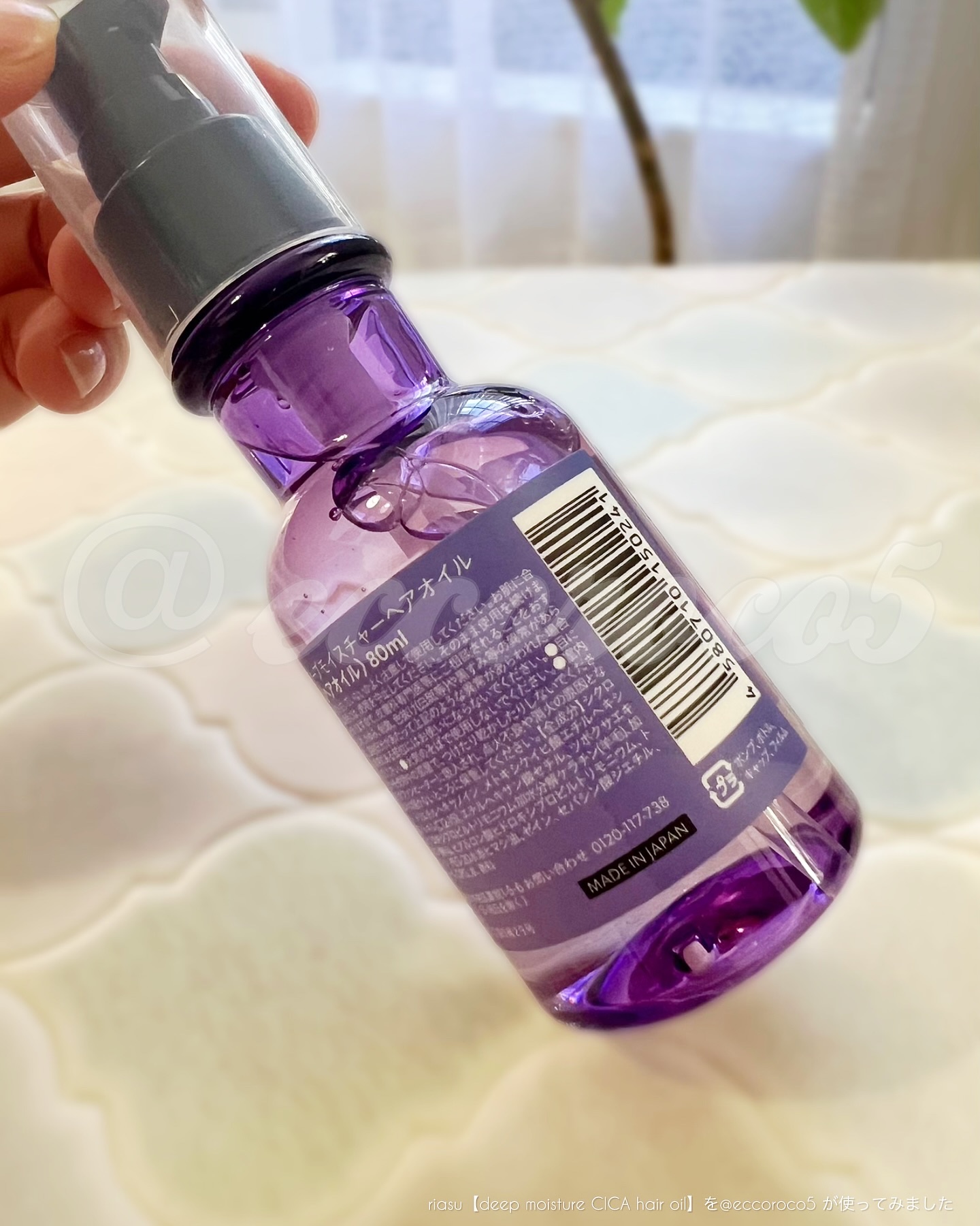少しとろみがある透明なオイルで、髪になじませやすく、髪もサラッと仕上がります! ポンプ式なので、ドライヤー前にポンッと手軽に押して使えます。 ブロッサム&カシスの香りはとてもいい匂いで、男性にも女性にも好まれそう。 ボトルデザインもシルバーなところがクールでスタイリッシュ。 乾いた髪につけると、ウェットな感じを出せるので、朝は毛先中心にワンプッシュ。 とても使いやすいヘアオイルです。