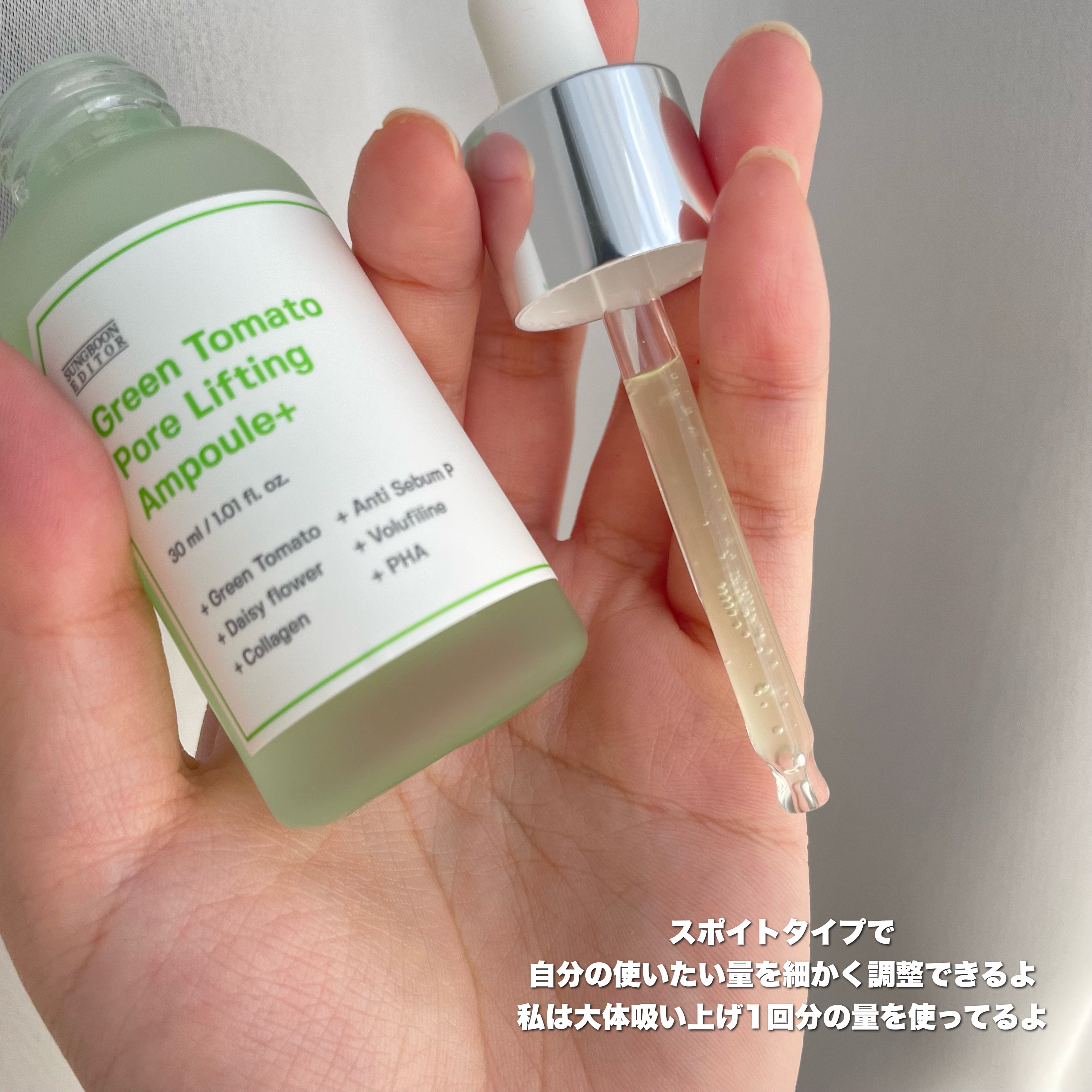 成分エディターグリーントマトポアリフティングアンプル縦毛穴、横毛穴、メラニン毛穴の気になる3種の毛穴にアプローチ!毛穴が気になっている方におすすめなアンプル😊低刺激テスト済みで朝も夜も使用可能!とろみがあるテクスチャーのアンプルを満べんなく塗...