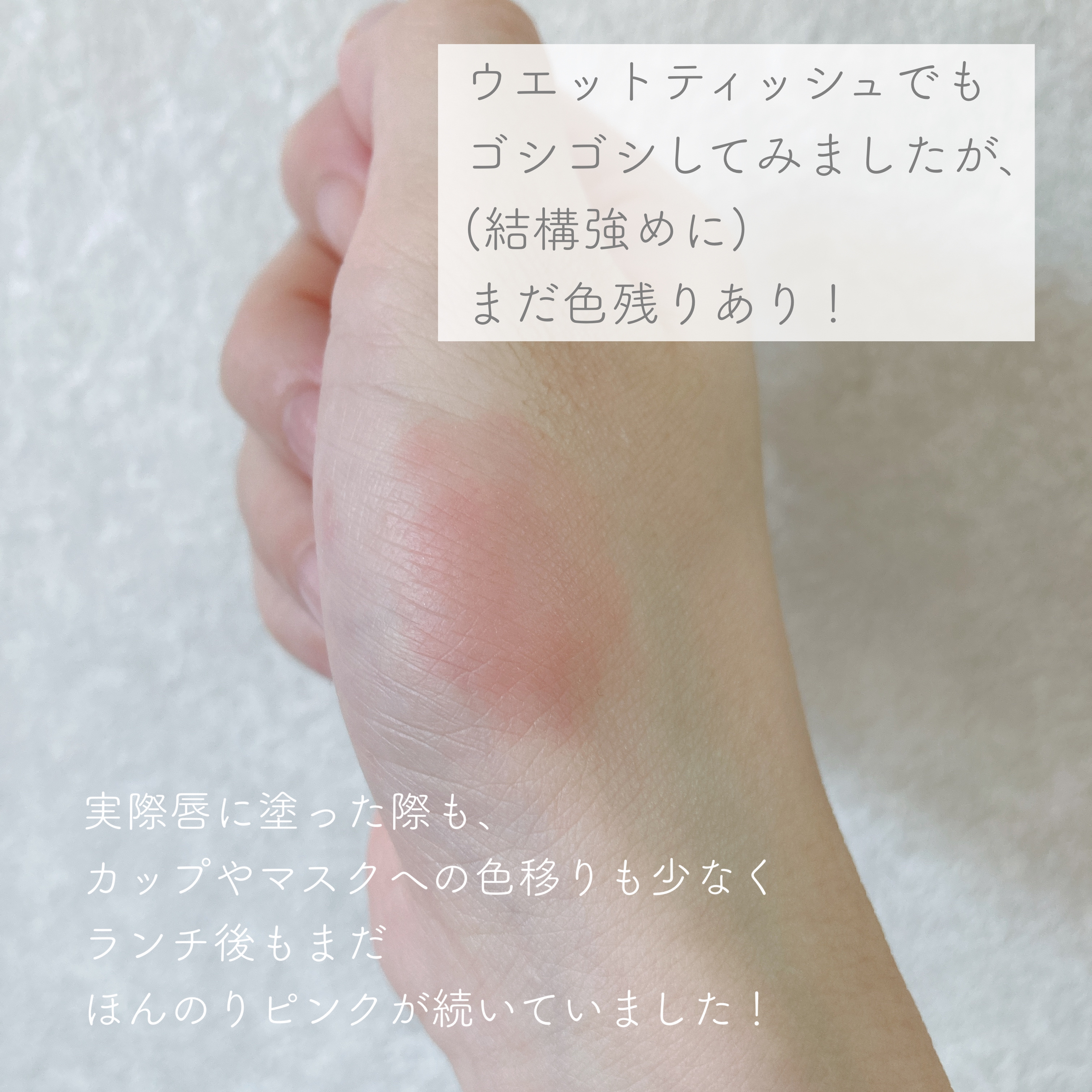 色味🐰🍁🍂赤よりも少しまろやかさを感じ、ブラウンでありながら体温を感じる、絶妙なカラーです☺️♡ 塗り心地🐰🍁🍂リップクリームのように、柔らかくするすると塗れます💡そして、全く乾燥しない😳!!塗りたては、程よく艶が出て本当に美しい仕上がり…🥺💓 色モチ🐰🍁🍂何もしないで2〜3時間程、マスクの着脱や飲食等をすれば1〜2時間くらいだと思います👀💡ティントではないので、普通に飲食をしたら落ちてしまいます😓保湿力が高く油分が多いためか、マスクやコップへの色移りは結構ありました🙇♂️