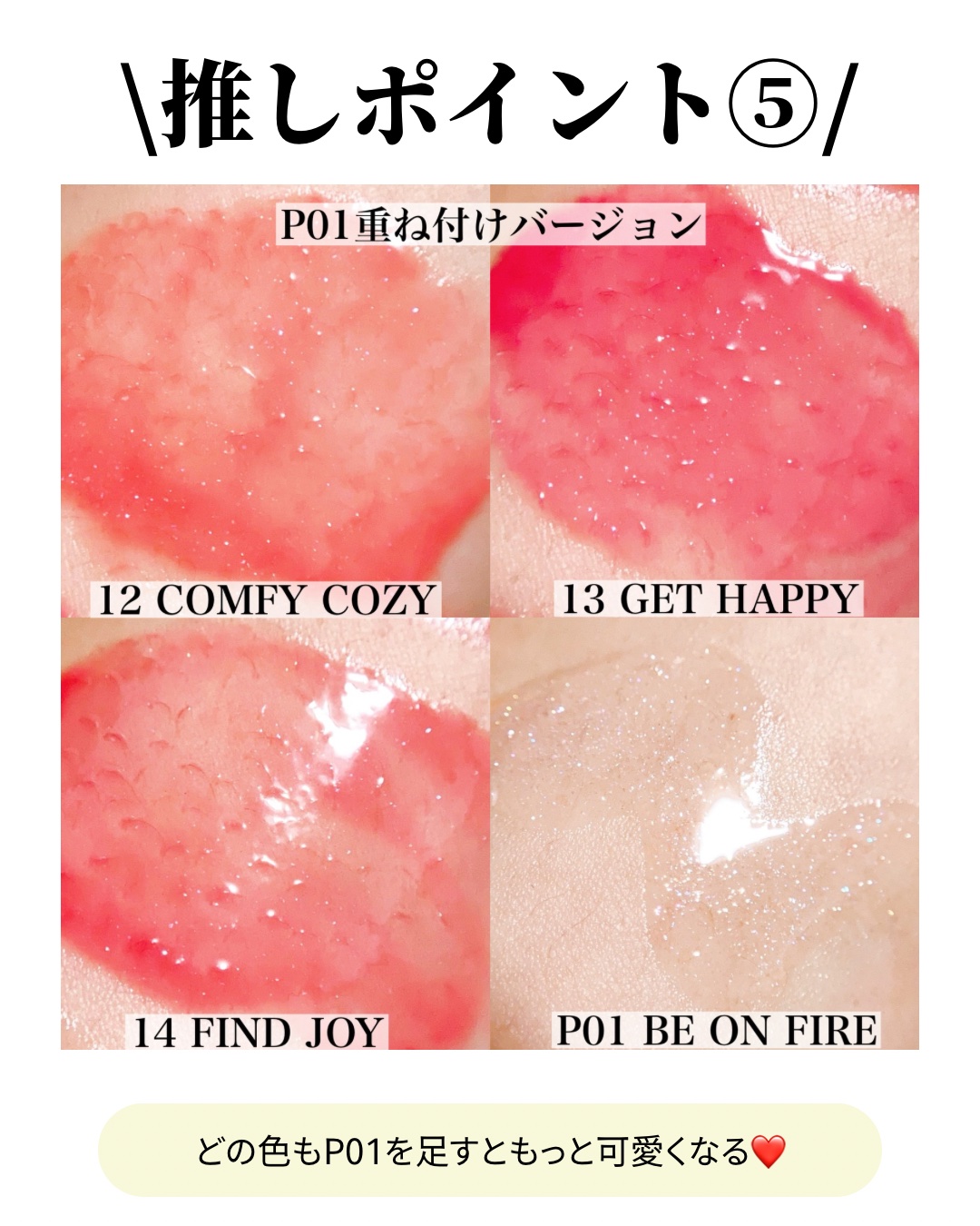 - ベタつかずグラッシーなボリューム&ツヤグロス ベタつかないテクスチャーでスッと伸びるソフトな使用感 ガラスのようなグラッシーなツヤでボリューム感のなる唇を演出 インクの鮮明なカラー感はそのまま!※当社調べ、個人差があります。 <02 エッジ ヌード(EDGE NUDE)> 肌トーンに自然と馴染むベーシックな雰囲気のエッジヌード <03 チリング ロージー(CHILLING ROSY)> ローズにクールレッドを1滴ポタッ、トーンダウンした奥深いローズカラーのチリングロージー <06 メイド イット(MADE IT)> レッドを一滴加えたトレンディーなハニーブラウン <08 ラブ オブ フェイト(LOVE OF FATE)> 毎日バッグに入れて持ち歩きたいヌーディーなデイリーピンク <09 グロウ オン ユー(GROW ON YOU)> ムードを完成させる奥深いチョコレートブラウン <12 コンフィー コージー(COMFY COZY)> あたたかさたっぷりソフトピンクコーラル <13 ゲット ハッピー(GET HAPPY)> ブルべカラーを集めたクールなうさぎ舌リップ <14 ファインド ジョイ(FIND JOY)> 華やかに見せてくれるチェリーピンク <P01 ビーオンファイア(BE ON FIRE)> 輝くピンクパールとプランピング成分*でボリューム感UP *バニリルブチル、乳酸メンチル(皮膚コンディショニング剤)