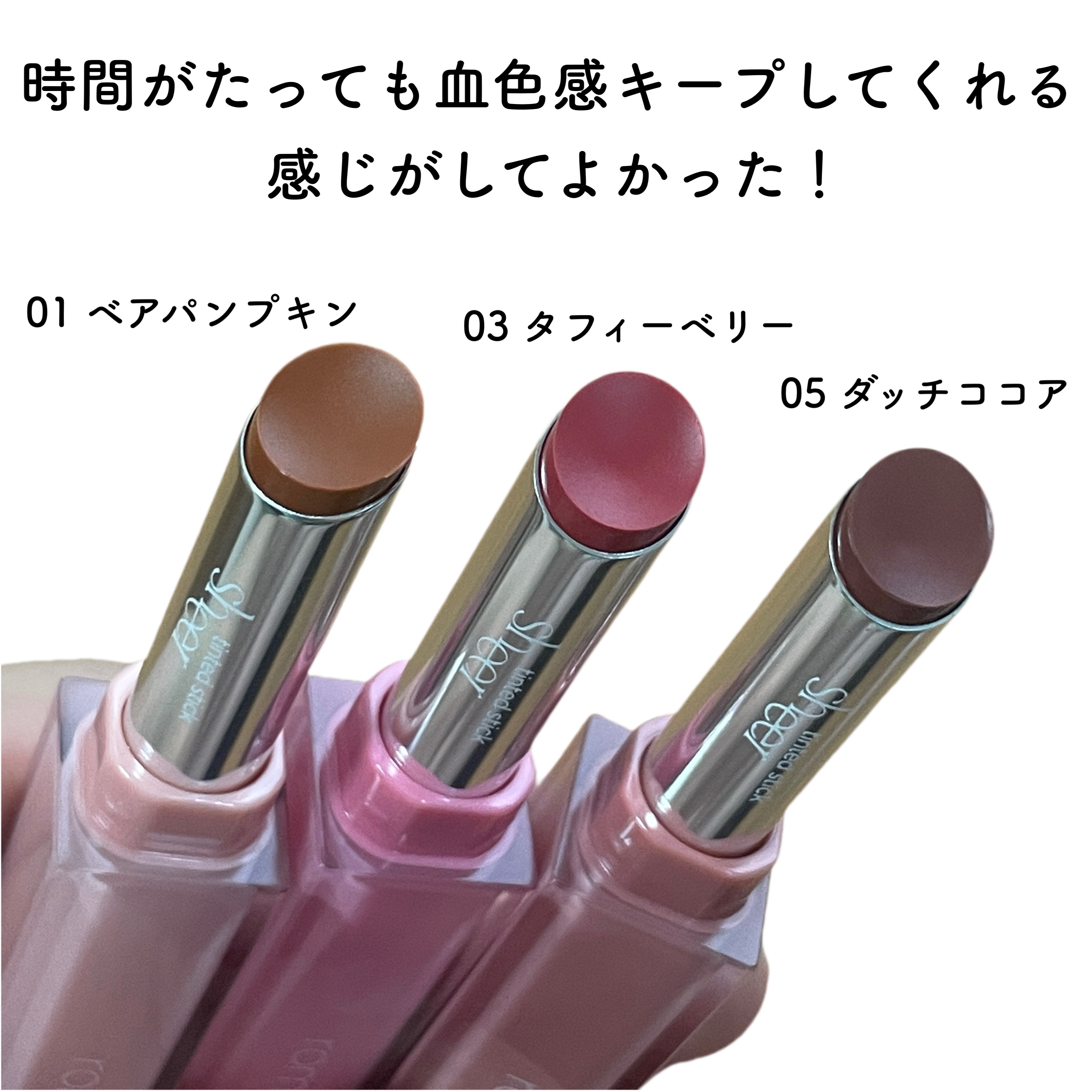 シアーティンテッドスティック全色をプレゼントして頂きました😭💞 透け感のある発色と自然なツヤ感でどんな場面でも使えるデイリーリップ💄 01 ベアパンプキン ベージュにオレンジを一滴加えた淡いヌーディーベージュ 🍊6色の中で1番ナチュラル✨️ 濃厚に熟したブドウのようなレッドプラムカラー🍇 お上品なプラムでグッと大人っぽさがUPするカラー!💋