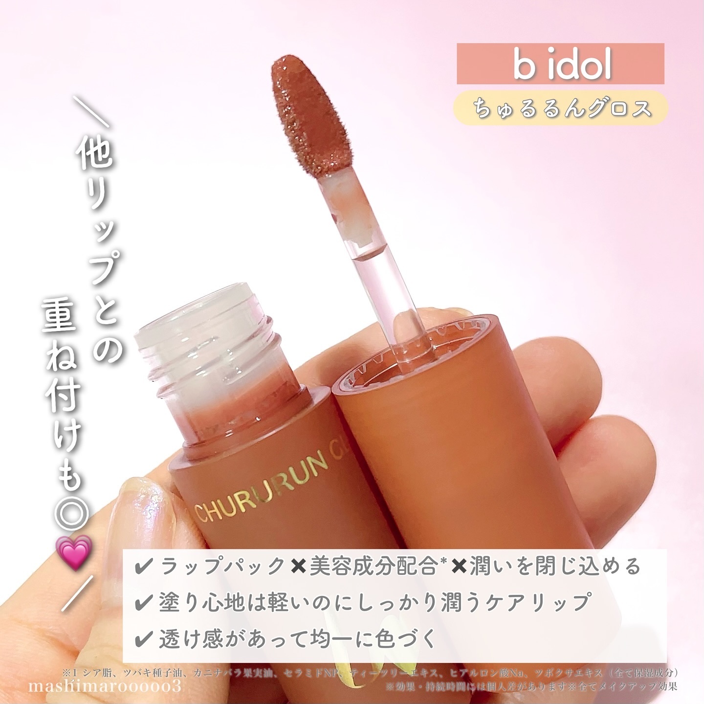 - 【重ねて塗って、唇だけで虜にする。】 むっちりぷっくり*1艶リップを演出♥ 24SS新定番発売! 「スキンケア感覚の艶グロス」 “ちゅるるんグロス” ラップパック×美容成分配合*2×潤いを閉じ込める こっくり系テクスチャーでぷっくりツヤツヤ。 美容成分がたっぷりで、ぴったり密着ラッピング。 乾燥から唇を保護します。 ぽってり*1♡うるちゅるな唇を演出。 ♥「01 ヌードスキン」うるうるしながら、可愛く守る。 *1 メイク効果による *2 シア脂、ツバキ種子油、カニナバラ果実油、セラミドNP、ティーツリーエキス、ヒアルロン酸Na、ツボクサエキス(全て保湿成分) うるうるしながら、可愛く守る。 スキンケア感覚の艶グロス。