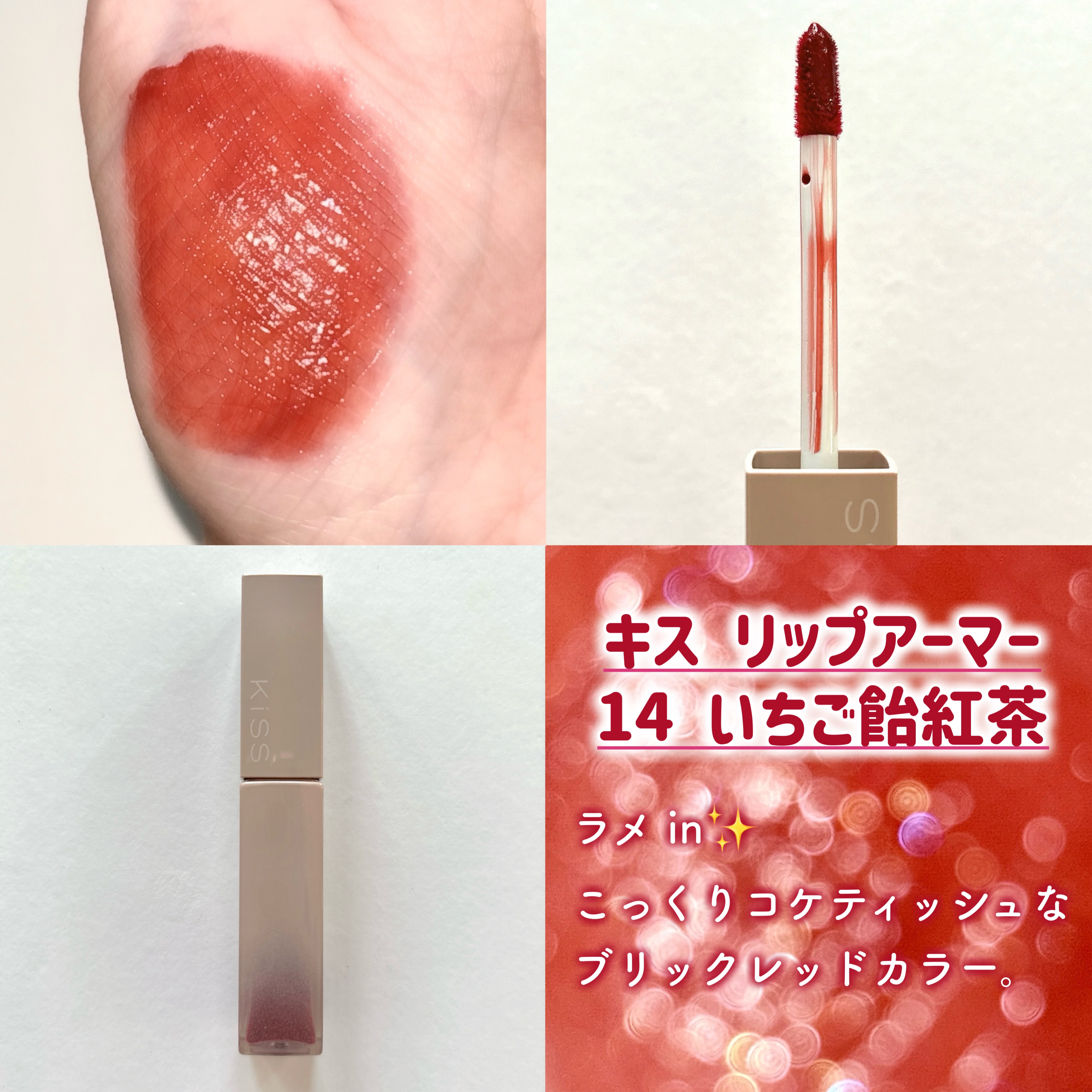 ツヤ×うるおい×落ちにくい仕上がりで人気の『リップアーマー』 数量限定の【金のリップアーマー】 ◆14 いちご飴紅茶 ラメ入りの深みのあるブリックレッド♡ 秋冬メイクにピッタリ♩ サラッとしたみずみずしいテクスチャーで 塗り心地がいい〜◎ ベタベタしないしクリアな発色で使いやすいのもオススメポイント⚐ ˒˒