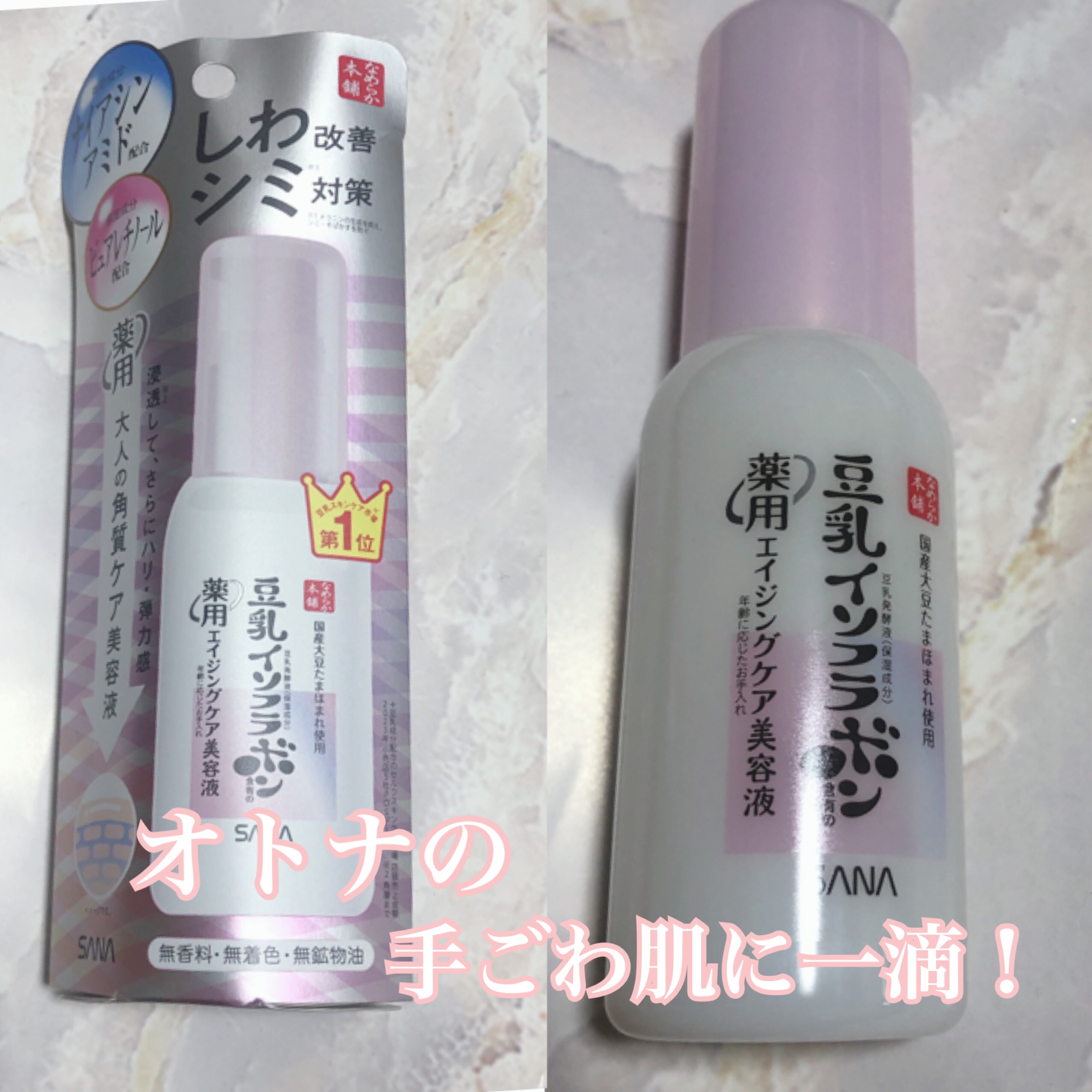 - 【医薬部外品】 浸透*1して、ハリ・弾力感 大人の角質ケア美容液 無香料・無着色・無鉱物油 豆乳発酵液含有の薬用エイジングケア*2美容液 しわ改善&シミ対策できる豆乳の角質ケア美容液 シミ対策:メラニンの生成を抑え、シミ・そばかすを防ぐ 有効成分ナイアシンアミドがお肌の奥まで届く! 角質にアプローチしながら、ハリ・透明感のある素肌へ。 乾燥が気になる大人のお肌に 乳酸(保湿成分):うるおいで角層をやわらかくなめらかに整えます。 豆乳発酵液(保湿成分):弾力感・うるおいを与え、ふっくらとした質感のお肌に。 ピュアレチノール(保湿成分):ビタミンAの一種で、ハリのあるお肌に。 ナイアシンアミド(有効成分):しわを改善し、メラニンの生成を抑え、シミ・そばかすを防ぎます。 ごわつきが気になるときに・・・コットン使い! 洗顔後、化粧水の前にコットンに適量(3プッシュ程度)をとり、お顔全体にやさしくくるくると広げてなじませてください。 つるんとハリ・透明感! 国産丸大豆「たまほまれ」使用 なめらか本舗「エイジングケアライン」オリジナルの豆乳発酵液(保湿成分)は、国内で栽培された大豆「たまほまれ」を丸ごと使用して作られています。 なめらか濃縮製法でつくるオリジナルの豆乳発酵液 豆乳発酵液に使用している大豆は、遺伝子組換えなし大豆を使用しています。 ●パッチテスト済み ●アレルギーテスト済み (すべての方に皮フ刺激やアレルギーが起きないわけではありません。) *1角層まで *2年齢に応じたお手入れ