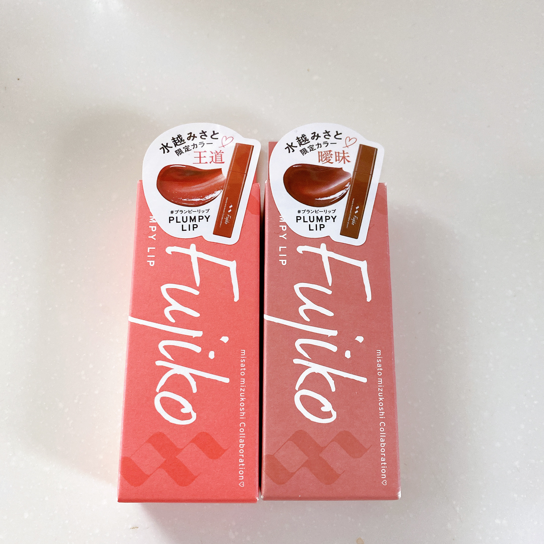 フジコの大人気プランピーリップと水越みさとさんがコラボした限定カラーのリップ購入して早速使用してみました!とにかく可愛い使いやすい!!☀️ ✨🙌 限定色の「曖昧」は枠にとらわれないベージュブラウンカラー✨ オイルウォーターティント処方でツヤ感も保湿感も大満足◎ブラウンですが少しピンクみもあるので適度に血色感が出て顔色が暗くならないところがオススメ!
