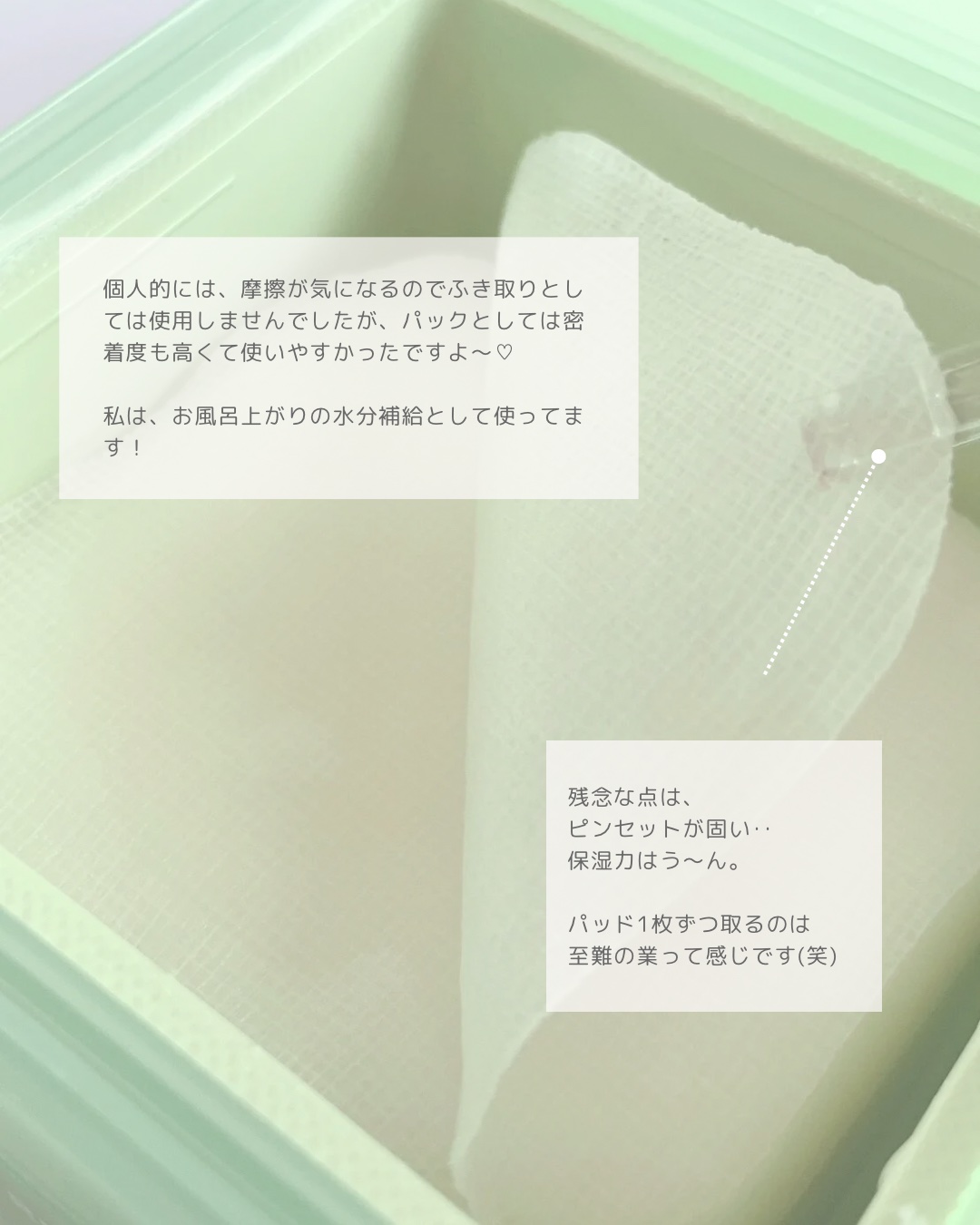 草っぽい独特な香り ガーゼのような肌触り ザラザラが消えて瑞々しい肌になった 私は敏感肌で肌が荒れやすいので鎮静効果があるパックやパッドを集めていてその中でよく活躍するパッドの1つです!! 大容量なところがまた嬉しいポイントです💡 パック系の中ではお値段が張る方だと思うので普段使いより特別なケアにぴったりかなと思いました!