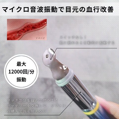 振動美顔器の方が指を使うより有効成分がより深く、より完全に浸透するんだって ビタミンK配合 血管と皮膚を丈夫にし、毛細血管を縮小させて目の下のクマの改善が期待できます 振動は敏感な目元でも気にならないほどやさしい使い心地✨ 気になっていたクマも目立たなくなってきて気に入っています