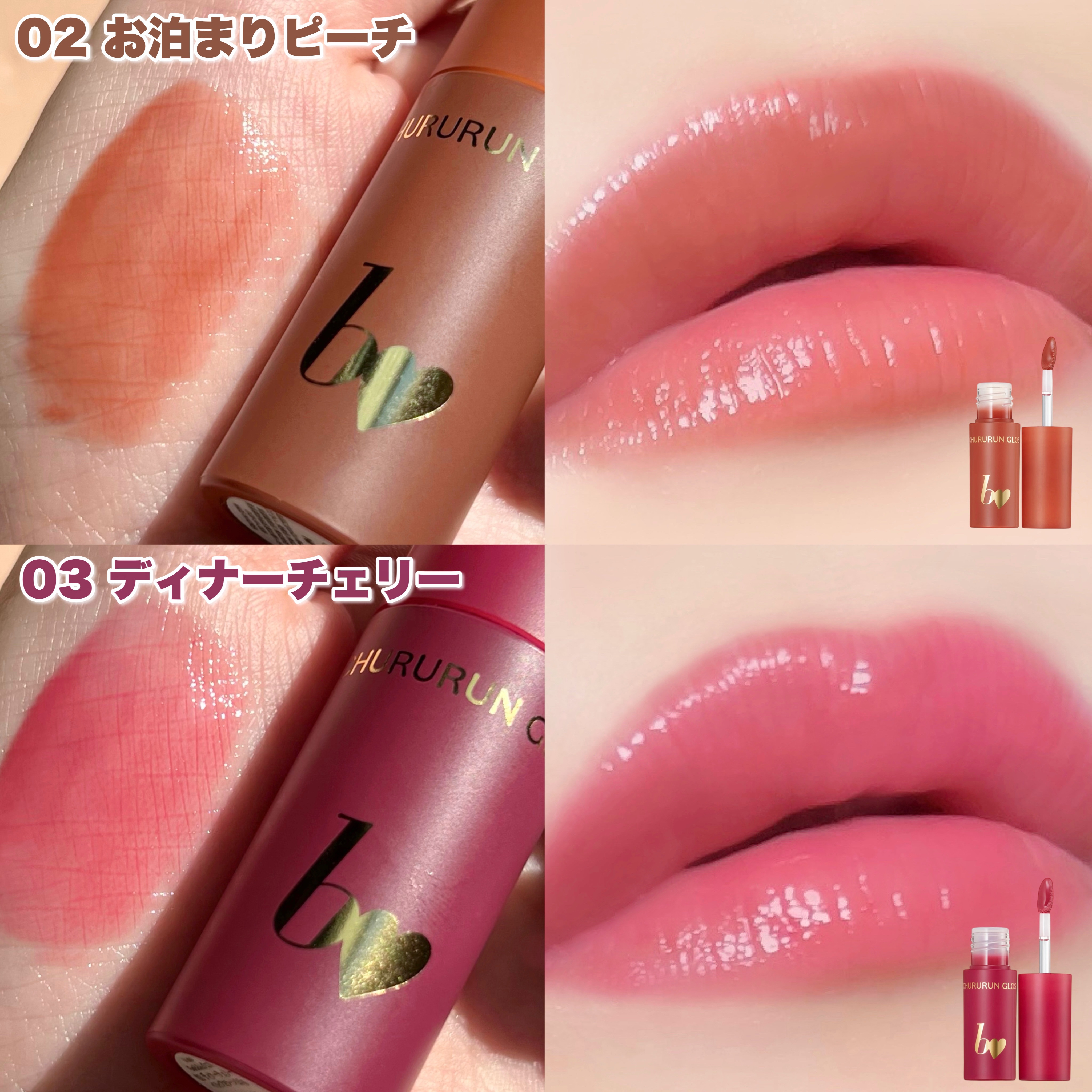 - 【重ねて塗って、唇だけで虜にする。】 むっちりぷっくり*1艶リップを演出♥ 24SS新定番発売! 「スキンケア感覚の艶グロス」 “ちゅるるんグロス” ラップパック×美容成分配合*2×潤いを閉じ込める こっくり系テクスチャーでぷっくりツヤツヤ。 美容成分がたっぷりで、ぴったり密着ラッピング。 乾燥から唇を保護します。 ぽってり*1♡うるちゅるな唇を演出。 ♥「01 ヌードスキン」うるうるしながら、可愛く守る。 *1 メイク効果による *2 シア脂、ツバキ種子油、カニナバラ果実油、セラミドNP、ティーツリーエキス、ヒアルロン酸Na、ツボクサエキス(全て保湿成分) うるうるしながら、可愛く守る。 スキンケア感覚の艶グロス。