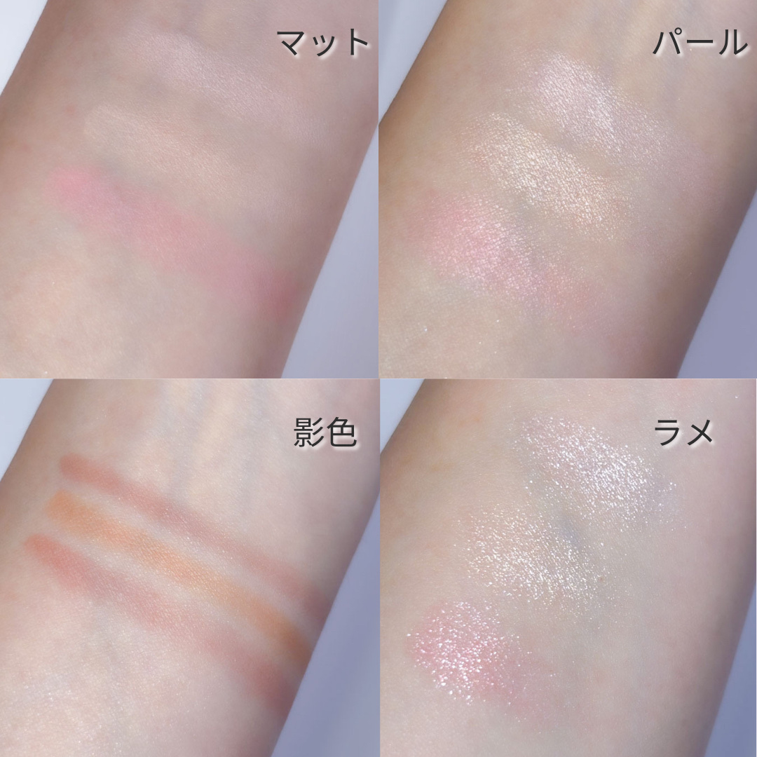 - マット・パール・ラメ入りで3パターンの涙袋が作れる 涙袋用アイシャドウパレット 涙袋用に3色、涙袋の影用に1色がセットされた涙袋用のアイシャドウパレットです。 その日の気分やTPOに合わせて選んでみてくださいね! マットは透け感があり目元のシワが気になりにくく、 パールは繊細で透明感のあるツヤっとした仕上がりに、 ラメはキラキラと輝く透け発色です。 涙袋の影用の「血色影カラー」は、影寄りの色なのに血色感もあって目元が暗くならない パウダーだからこそできた絶妙な色味なんです!