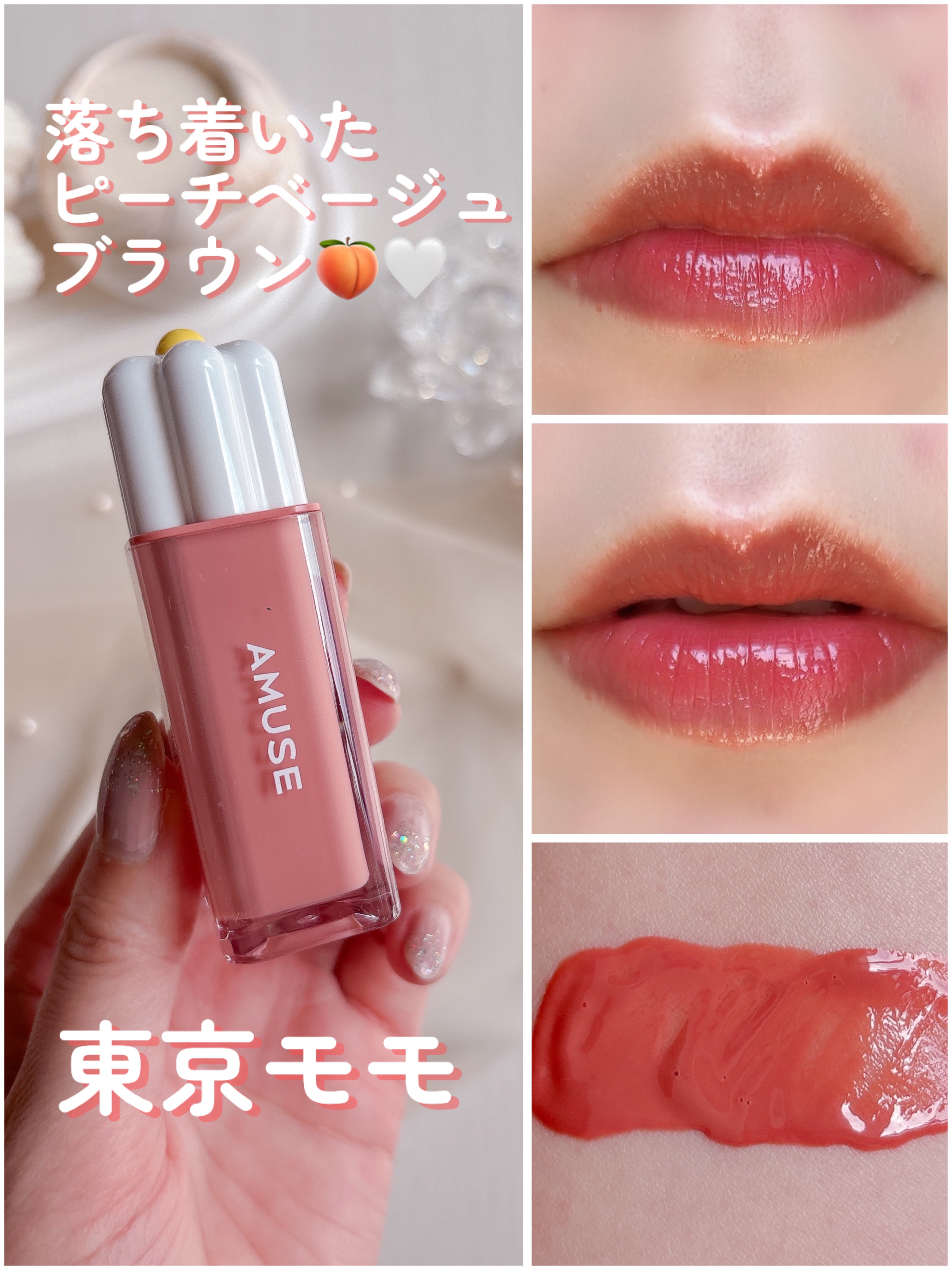 35%高水分のウォーターテクスチャーでベタつきのないロングラスティング透けちゅるリップ💓 東京モモは、血色感を演出するAMUSEのモモカラーに透明感のあるベージュを一滴加えて、柔らかく大人っぽいカラーへ。 なにより、デイジー🌼キャップが可愛すぎね!! 持ってるだけでテンションあがっちゃう。