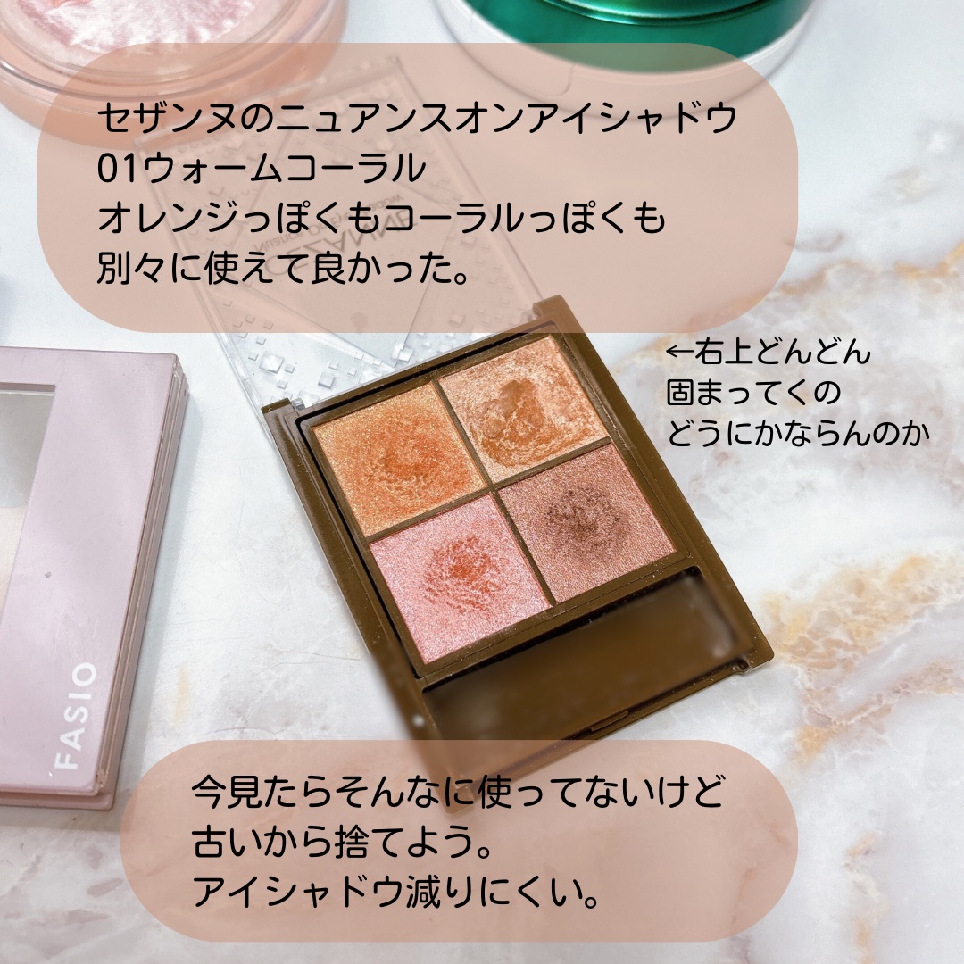 溶け合う色とパールで上品にツヤめく目元へ〜 AのラメとCのオレンジが特に可愛い! オレンジは目尻側に使うのが基本の使い方だけど濃すぎないから目頭側から使っても違和感なかったよ👌 1st2ndイエベの自分的にちょうど良い色合いで同じく廃番になる01のウォームコーラルよりも気に入った♪