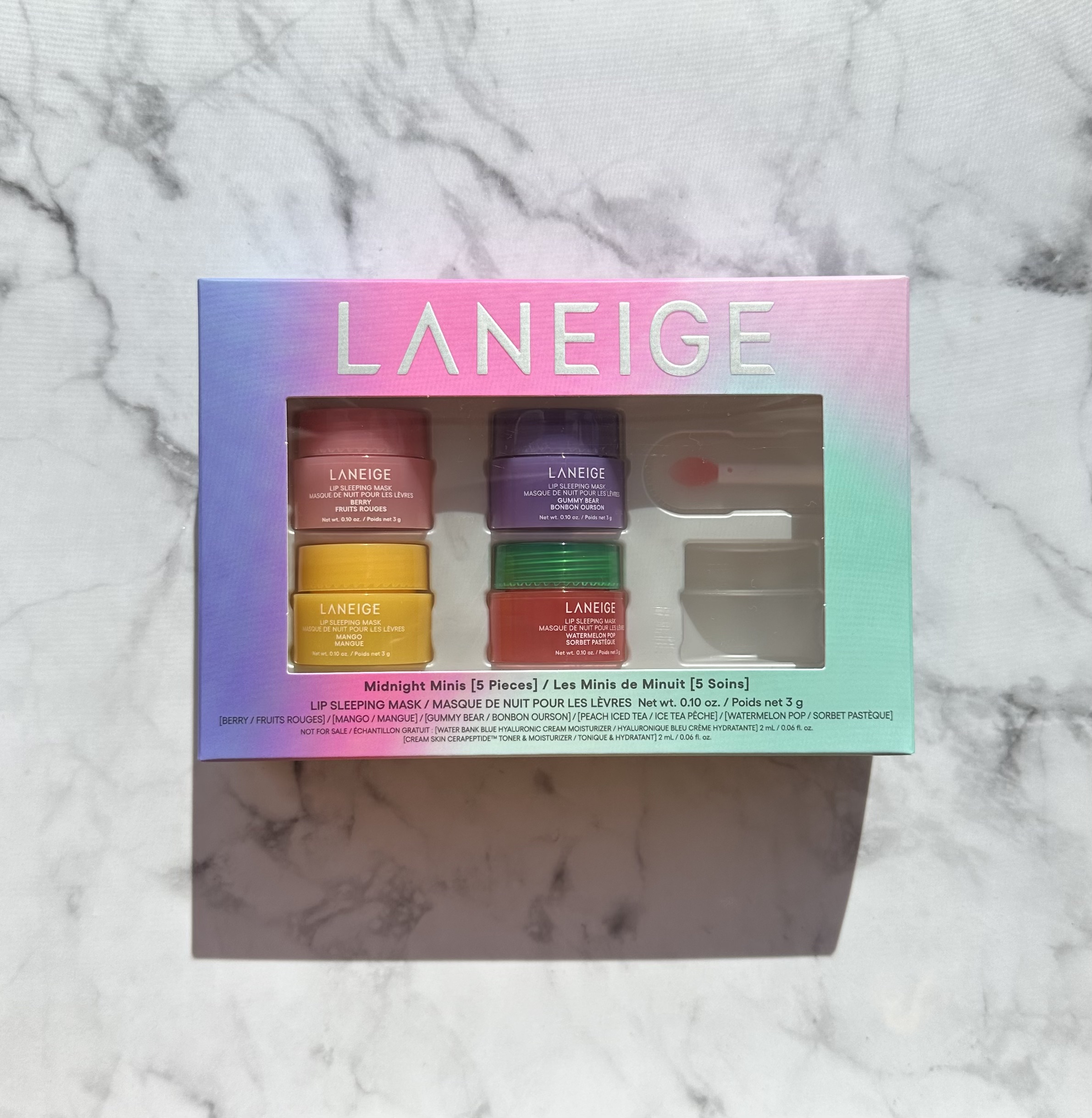 LANEIGE リップマスクのフレーバー5種類が入ったミニサイズ(1個3g)のスペシャルキット✨ 内容は定番のベリー、グミベアに加え、限定のマンゴー、ウォーターメロン、ピーチアイスティーを含む計5種 毎晩どのフレーバーにしようか悩めるのが嬉しいです🌠