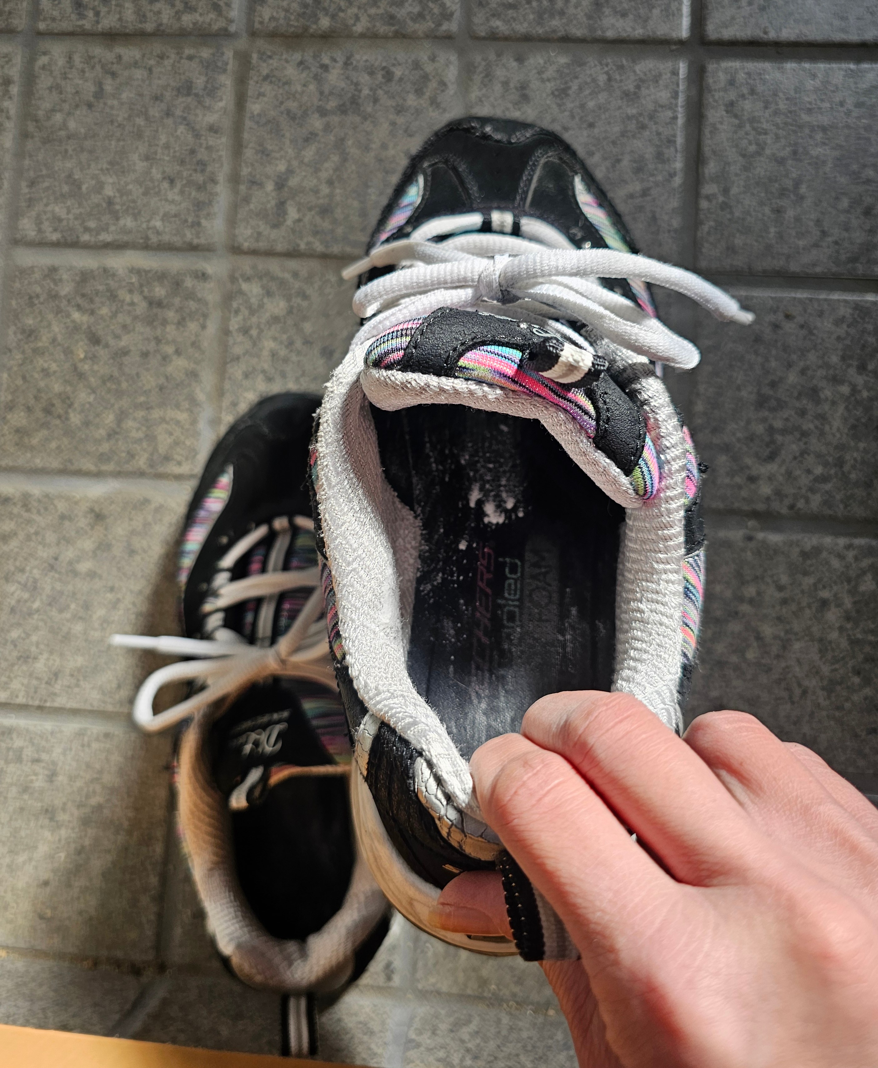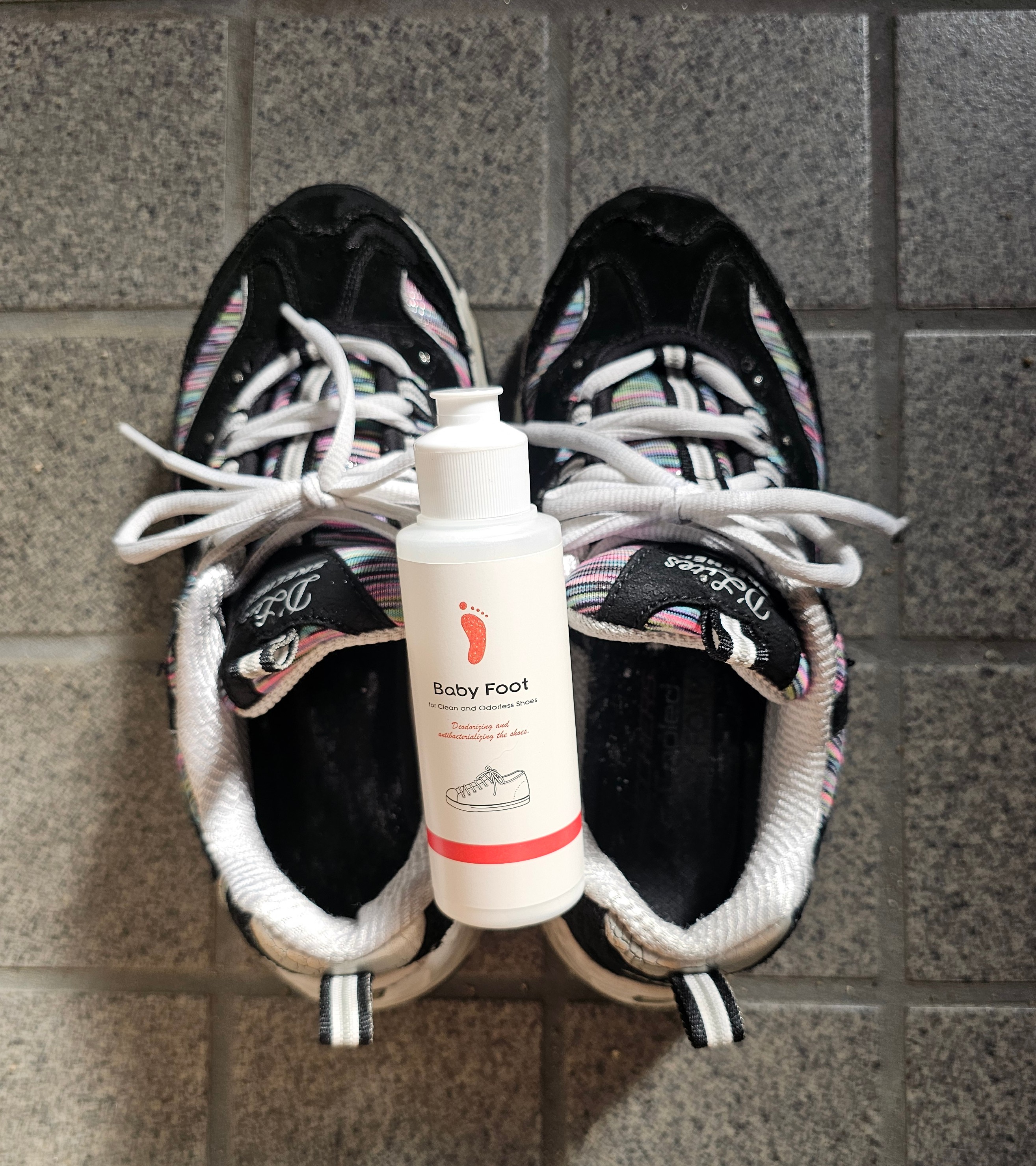 靴の消臭除菌パウダーは便利なアイテムなんです。 片栗粉のような粒子の細かいサラサラのパウダー。香りもないので、靴の匂いと混ざって変な香りがしないのも嬉しいポイントです。 朝にパウダーを振ってから履いて夜になると靴の匂いがマシになっていてすごくびっくりしました。