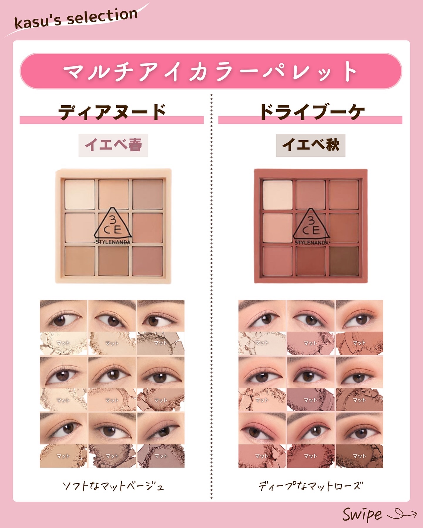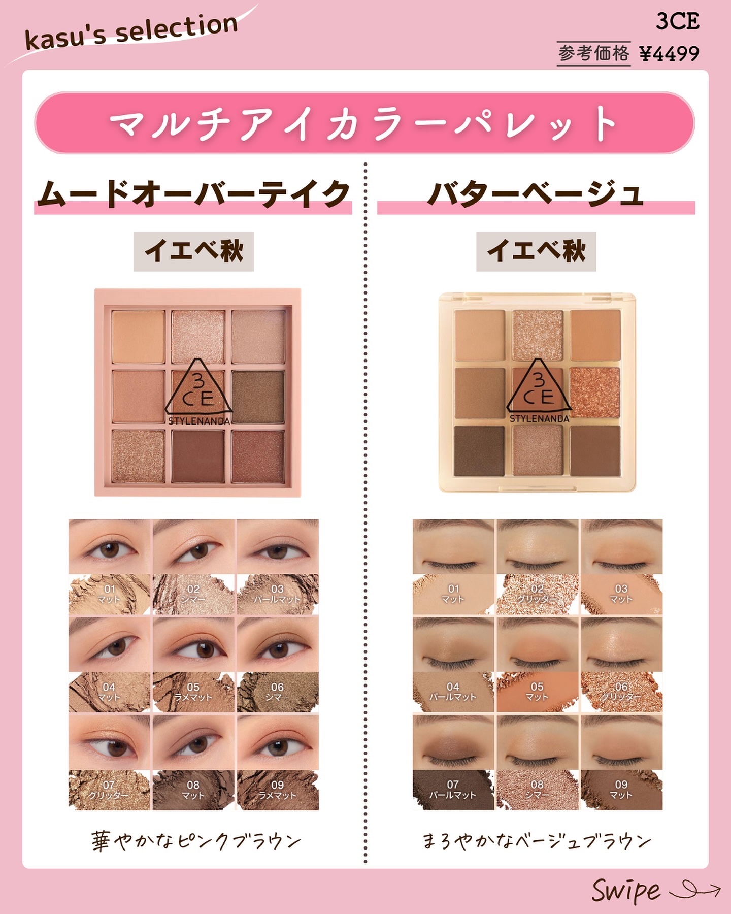 このブラウンパレット可愛い…🤎トレンドの#モカムースメイクにも使えるよ!****3CEニューテイクアイシャドウパレットGクワイエットブラウン****ほんのり甘く華やかな目元に✨マットカラーはサラサララメ入りカラーはしっとり密着感あり♡全体的に...
