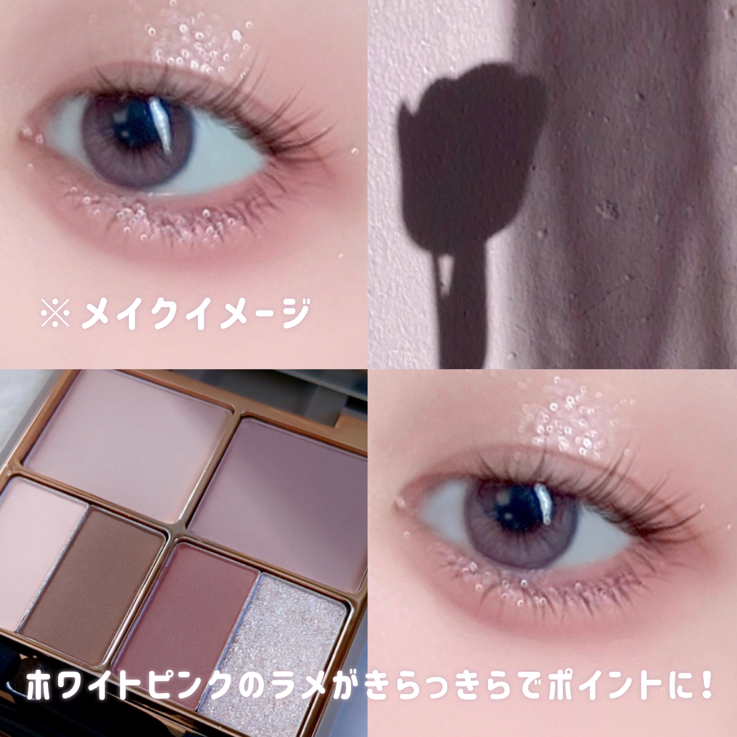 chunさんプロデュースのアイシャドウパレット🎀 柔らかいミュート系のカラーです!全体的に明るいですが重ね塗りしても白浮きしにくいのでパーソナルカラー気にせず使ってみて欲しいです! ラメはシルバーやピンク、パープルなどの多色ラメ✨ 小粒ですが存在感があり目元が華やかになります! 涙袋の影をこれで描くのもおすすめです! このカラー1色で時短メイクもできます!