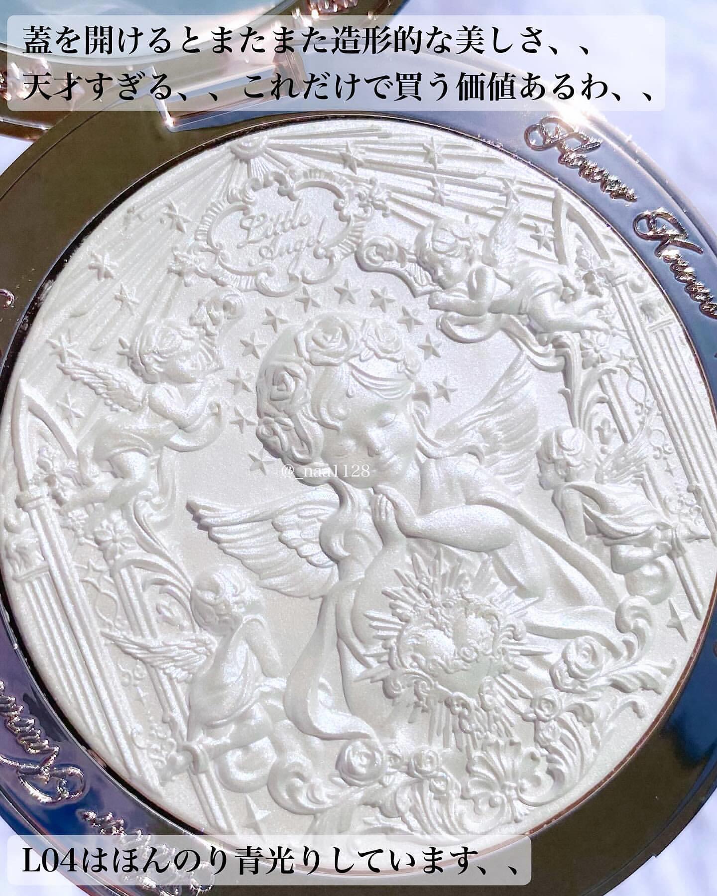 - ステンドグラスの前で天使が祈りをささげている姿が美しいコンパクトです。 中身にも西洋神話をモチーフに繊細な彫刻されています。革新的な[低温脱水技術]パウダー <L01 Eros's Fable (愛神寓言)> シャンパンピンクベースにほんのりパール配合、ほど良いパールの輝きで温かみのある印象に。 <L02 Paradise Lost (失楽園)> シャンパンゴールドベースに細かなパールをプラス。より肌なじみの良いハイライターとなります。 <L03 Chanting Anthem (詠嘆賛歌)> 薄く延ばすだけで、イルミネーションのような輝きを演出。小鼻、鼻の根元、目元、眉尻にのせ繊細で立体的な印象になります。 <L04 Moon River (月亮河)> ブルーとパープルのダイヤモンドが織り成す天の川のような偏光カラー。ハイライトとして顔全体に使用可。鎖骨や肩にもおすすめ。ドリーミーなルックを演出します。
