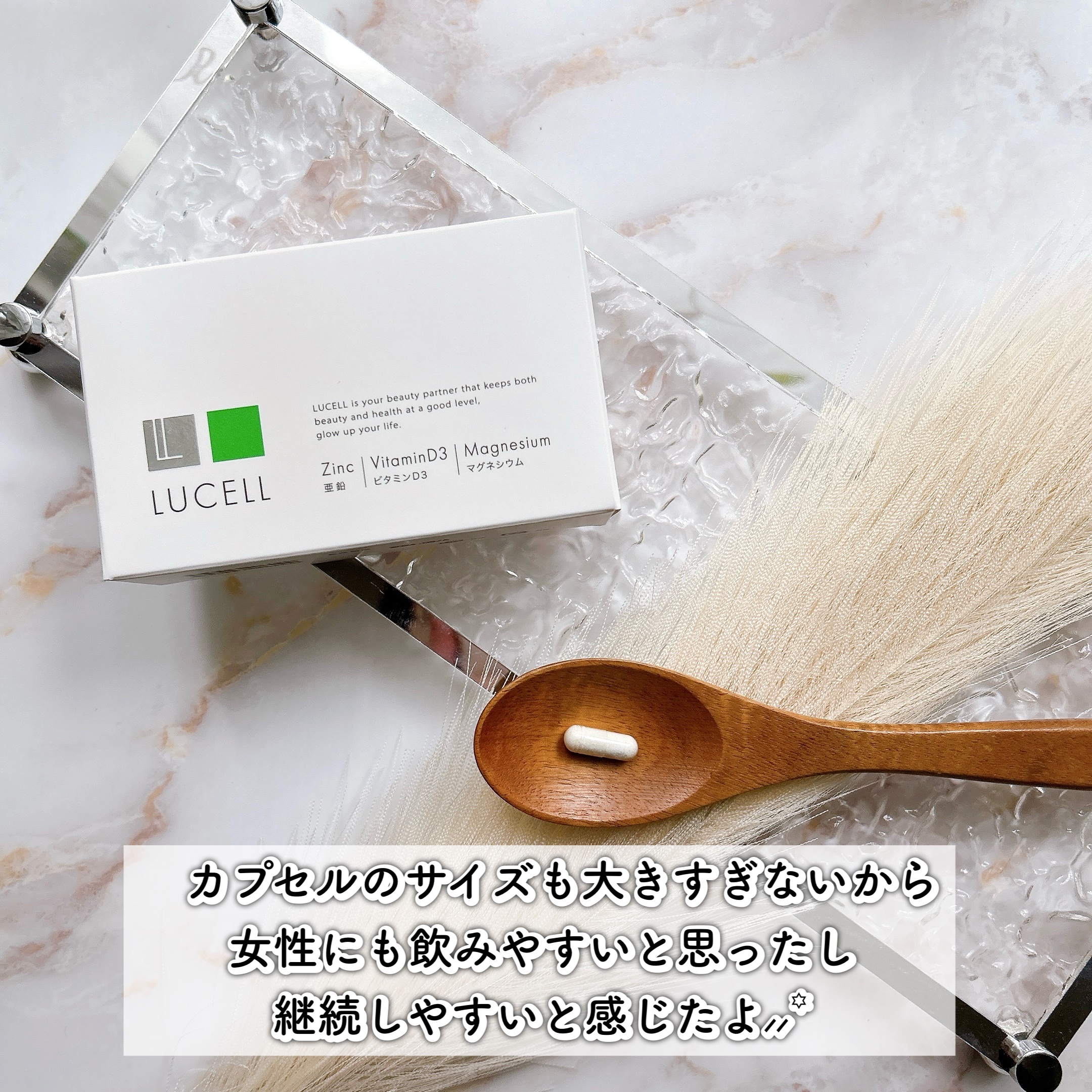 - LUCELL ビタミンD3 亜鉛 マグネシウムは、リゾナスフェイスクリニック東京監修のもと開発されたサプリメントです。1日に必要なビタミンD3と亜鉛を小さなカプセル1粒で摂取でき、食事では補いきれない栄養素をサポートします。グルテンフリー、アルコールフリーで毎日の健康維持に取り入れていただけます。 【飲み方】1日1粒目安、水またはぬるま湯でお召し上がりください