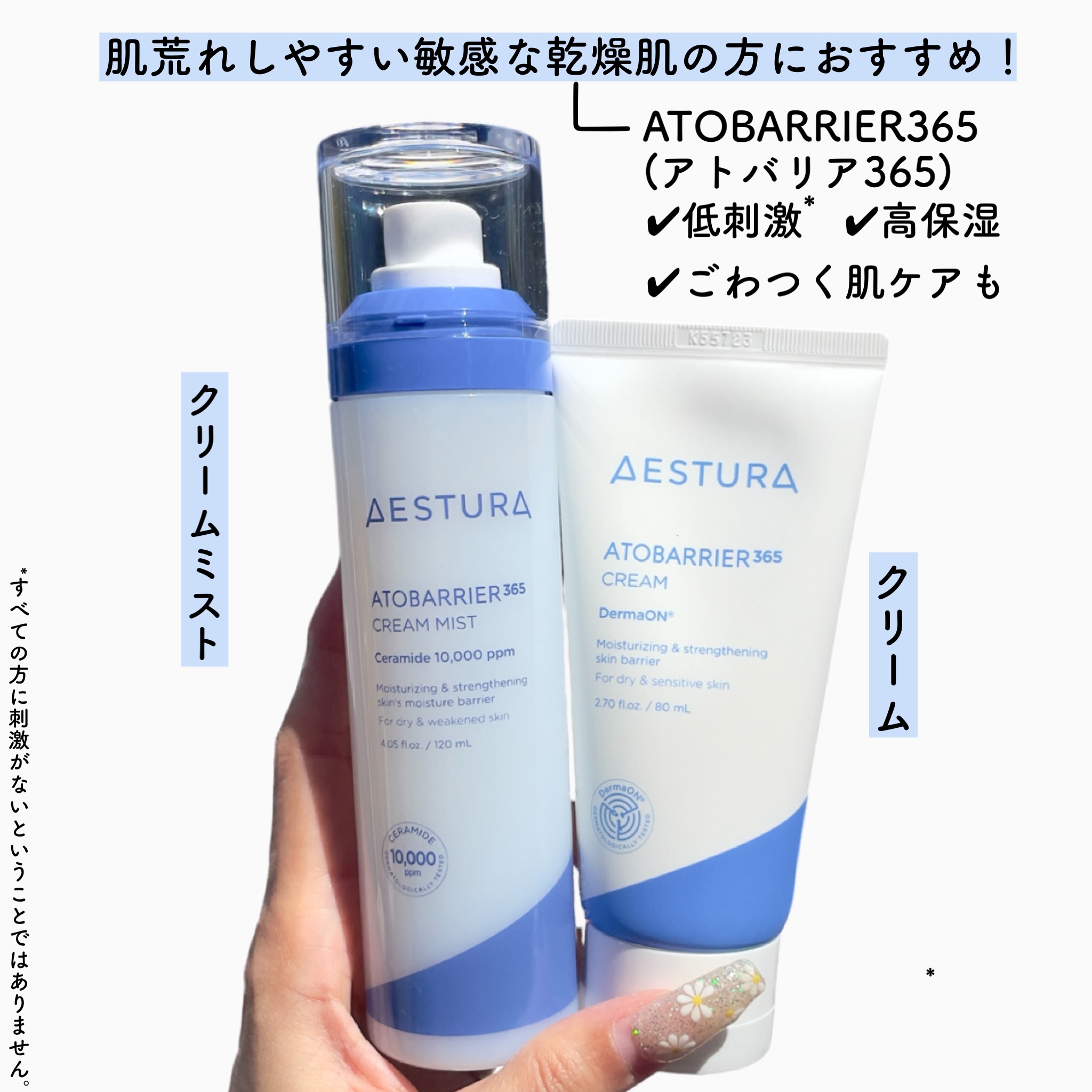 エストラ アトバリア365「クリーム」&「クリームミスト」でALL DAY保湿🚿 セラミド高配合だから、ミスト化粧水なのにクリーム級のうるおい感でしっとり〜🫧 独自『高密度セラミドカプセル約100万個配合。つぶつぶのカプセルが肌に溶けだし、肌表面に長くとどまってうるおい続くんだって!