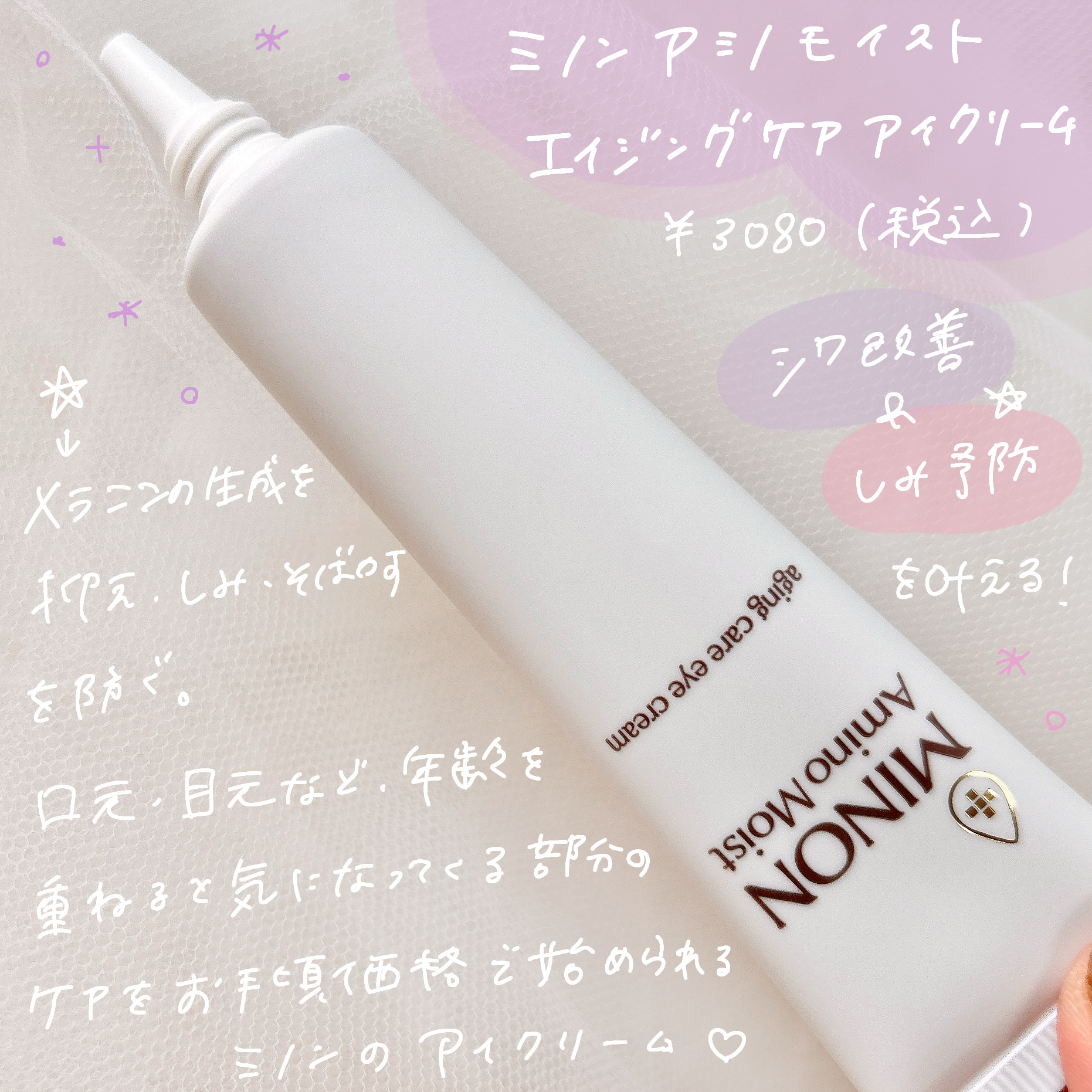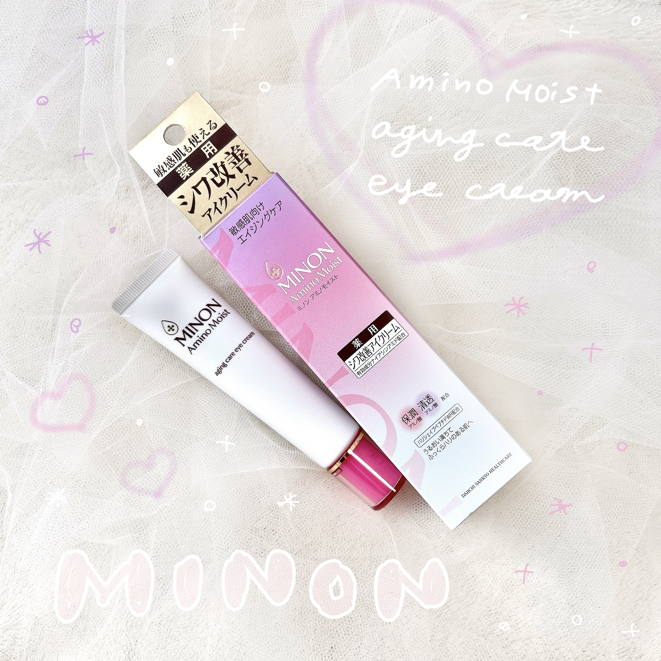 - 【敏感肌も使える薬用シワ改善アイクリーム】 ダブルの有効成分配合。気になるシワを改善し、しみ・そばかす*1、肌あれを防ぎます。 ●ナイアシンアミド:シワ改善&しみ予防 ●グリチルリチン酸2K:肌あれ予防 ハリを与えつや肌に導く「ハリシェイプペプチドWR*2」配合。 使い続けるたび、シワを改善し、うるおってハリのある明るい印象の目元へ。 エイジングケア:年齢に応じたお手入れケア *1メラニンの生成を抑え、しみ・そばかすを防ぐ *2ヤシ油脂肪酸水解コラーゲンK (販売名:ミノンアミノモイストAE)【医薬部外品】
