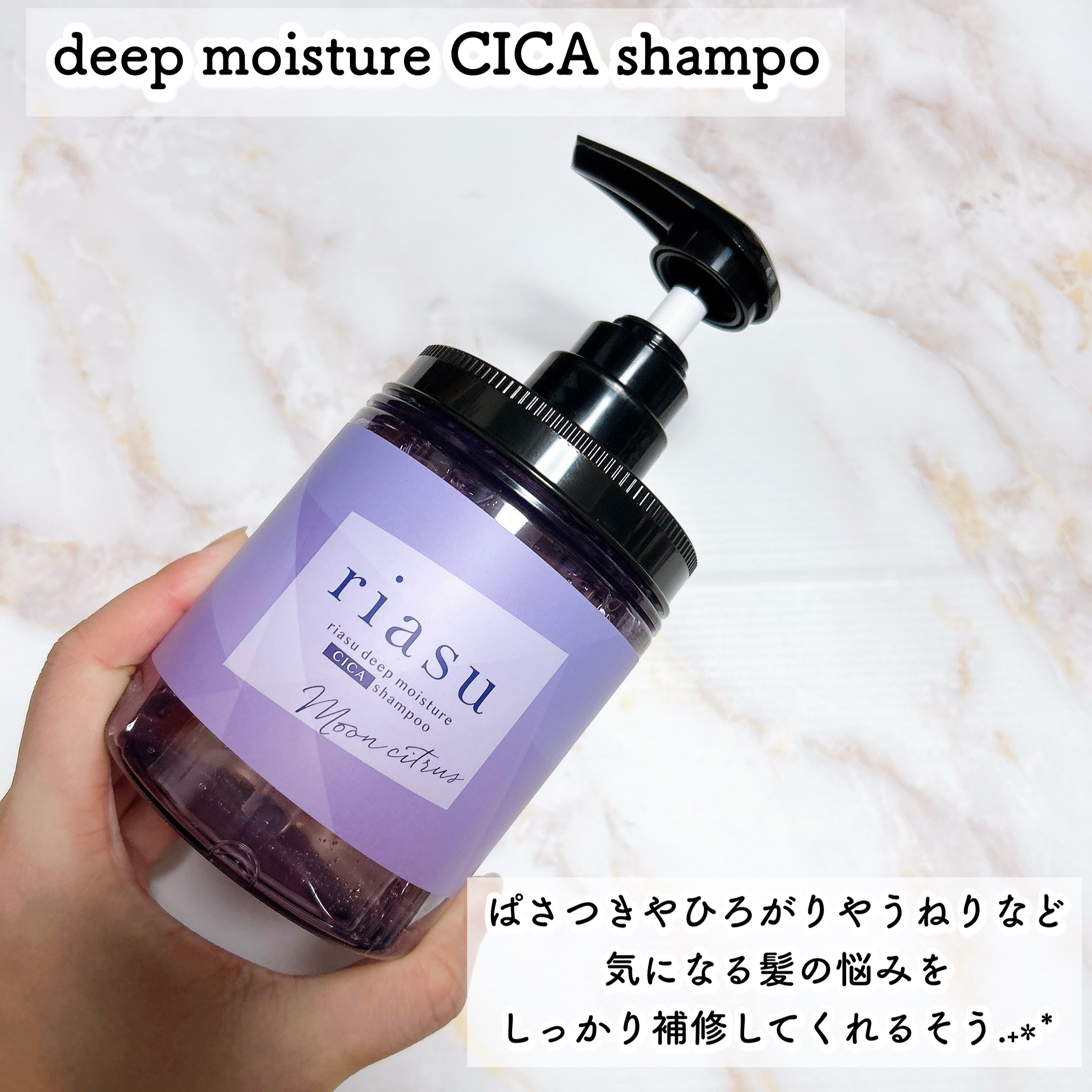 riasudeepmoistureCICAshampoo/treatment プレゼントキャンペーンで提供頂きました。ムーンシトラスの香りはラベンダー、ティーツリーなど安らかで上品な香りがいい🌙𖤐⡱泡立ちもよく、きしまず洗えるよ!翌朝起きた...