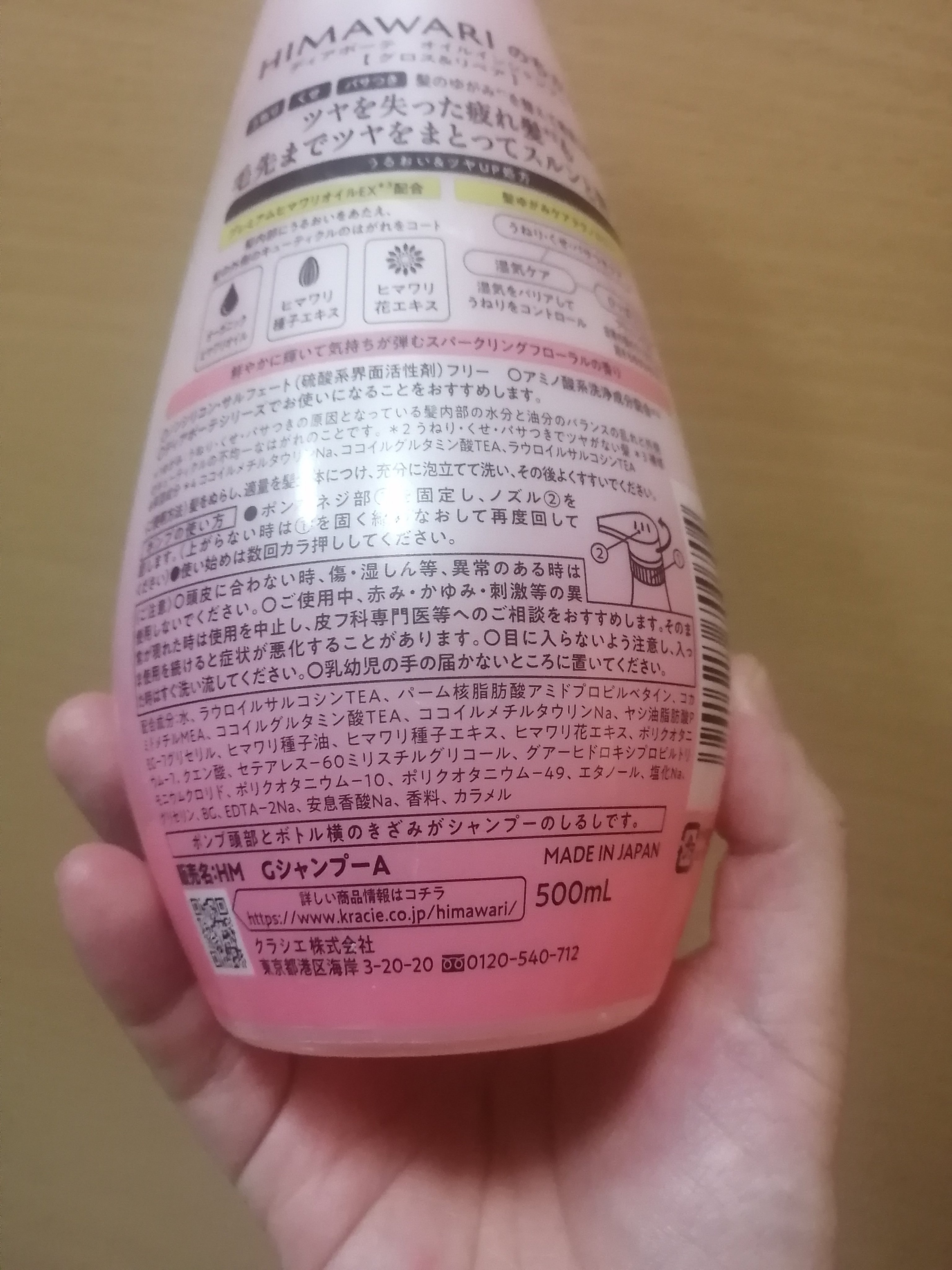 - <シャンプー本体> 水、ラウロイルサルコシンTEA、パーム核脂肪酸アミドプロピルベタイン、コカミドメチルMEA、ココイルグルタミン酸TEA、ココイルメチルタウリンNa、ヤシ油脂肪酸PEG-7グリセリル、ヒマワリ種子油、ヒマワリ種子エキス、ヒマワリ花エキス、ポリクオタニウム-7、クエン酸、セテアレス-60ミリスチルグリコール、グアーヒドロキシプロピルトリモニウムクロリド、ポリクオタニウム-10、ポリクオタニウム-49、エタノール、塩化Na、グリセリン、BG、EDTA-2Na、安息香酸Na、香料、カラメル <コンディショナー本体> 水、ラウロイルサルコシンTEA、パーム核脂肪酸アミドプロピルベタイン、コカミドメチルMEA、ココイルグルタミン酸TEA、ココイルメチルタウリンNa、ヤシ油脂肪酸PEG-7グリセリル、ヒマワリ種子油、ヒマワリ種子エキス、ヒマワリ花エキス、ポリクオタニウム-7、クエン酸、セテアレス-60ミリスチルグリコール、グアーヒドロキシプロピルトリモニウムクロリド、ポリクオタニウム-10、ポリクオタニウム-49、エタノール、塩化Na、グリセリン、BG、EDTA-2Na、安息香酸Na、香料、カラメル <シャンプー詰替> 水、ラウロイルサルコシンTEA、パーム核脂肪酸アミドプロピルベタイン、コカミドメチルMEA、ココイルグルタミン酸TEA、ココイルメチルタウリンNa、ヤシ油脂肪酸PEG-7グリセリル、ヒマワリ種子油、ヒマワリ種子エキス、ヒマワリ花エキス、ポリクオタニウム-7、クエン酸、セテアレス-60ミリスチルグリコール、グアーヒドロキシプロピルトリモニウムクロリド、ポリクオタニウム-10、ポリクオタニウム-49、エタノール、塩化Na、グリセリン、BG、EDTA-2Na、安息香酸Na、香料、カラメル <コンディショナー詰替> 水、ラウロイルサルコシンTEA、パーム核脂肪酸アミドプロピルベタイン、コカミドメチルMEA、ココイルグルタミン酸TEA、ココイルメチルタウリンNa、ヤシ油脂肪酸PEG-7グリセリル、ヒマワリ種子油、ヒマワリ種子エキス、ヒマワリ花エキス、ポリクオタニウム-7、クエン酸、セテアレス-60ミリスチルグリコール、グアーヒドロキシプロピルトリモニウムクロリド、ポリクオタニウム-10、ポリクオタニウム-49、エタノール、塩化Na、グリセリン、BG、EDTA-2Na、安息香酸Na、香料、カラメル