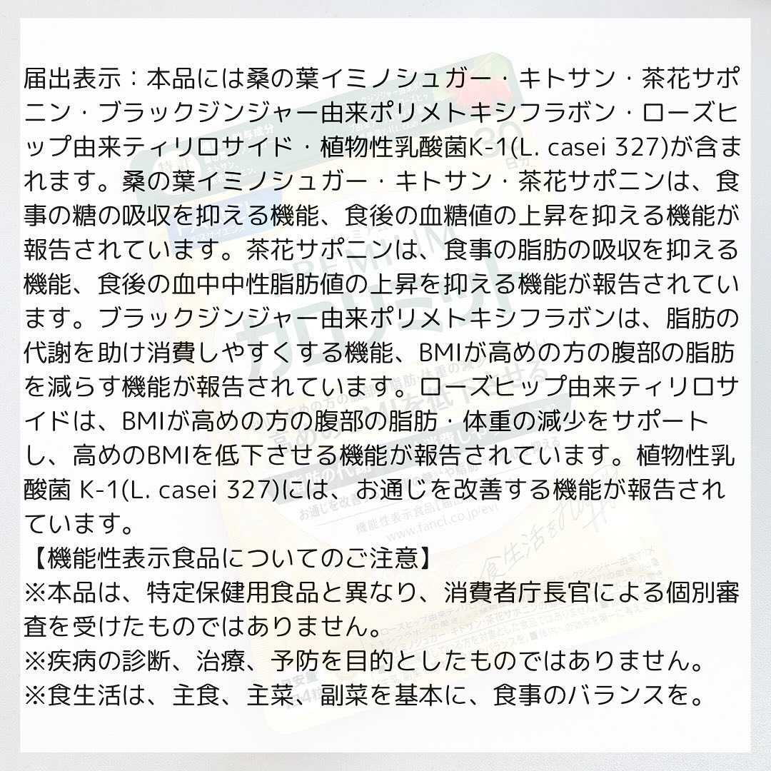 - 【機能性表示食品】 おいしく幸せに食べたい気持ちをサポートするファンケル「カロリミット」ブランドに本気で取り組みたい人に向けた“カロリミット史上最強”の製品が誕生 <お客様の「変わりたい」をサポートする製品設計> カロリミットブランドが持つ、糖と脂肪の吸収を抑える食事サポート機能はそのままに、お客様の変わりたいというニーズをサポートするために、新たに高めの BMI を低下させる機能が報告されている「ローズヒップ由来ティリロサイド」を加えました。 またお通じを改善する機能が報告されている「植物性乳酸菌 K-1(L. casei 327)」を配合。 (届出表示) 本品には桑の葉イミノシュガー・キトサン・茶花サポニン・ブラックジンジャー由来ポリメトキシフラボン・ローズヒップ由来ティリロサイド・植物性乳酸菌K-1(L. casei 327)が含まれます。 桑の葉イミノシュガー・キトサン・茶花サポニンは、食事の糖の吸収を抑える機能、食後の血糖値の上昇を抑える機能が報告されています。茶花サポニンは、食事の脂肪の吸収を抑える機能、食後の血中中性脂肪値の上昇を抑える機能が報告されています。ブラックジンジャー由来ポリメトキシフラボンは、脂肪の代謝を助け消費しやすくする機能、BMIが高めの方の腹部の脂肪を減らす機能が報告されています。ローズヒップ由来ティリロサイドは、BMIが高めの方の腹部の脂肪・体重の減少をサポートし、高めのBMIを低下させる機能が報告されています。 植物性乳酸菌 K-1(L. casei 327)には、お通じを改善する機能が報告されています。 <継続しやすい製剤設計> 当社独自の製剤技術により、目安量の 1 日 4 粒を実現し、お客様に継続して摂取いただけるよう工夫しました。 併せて剤形のコーティング技術により、配合成分が持つ独特の臭いなどを抑え、食事の邪魔をしない設計にこだわりました。 <親しみやすさと高品質な印象を両立したパッケージデザイン> 製品特長が分かりやすく、選びやすいことに加え、カロリミットブランドが持つ明るく親しみやすい印象と上品な金色による高級・高品質な印象の両立にこだわりました。 【アレルゲン(28品目中)】 かに 【ご注意】 ※妊娠・授乳中の方、未成年の方はお召し上がりにならないでください。 ※本品は、特定保健用食品と異なり、消費者庁長官による個別審査を受けたものではありません。 ※疾病の診断、治療、予防を目的としたものではありません。 ※食生活は、主食、主菜、副菜を基本に、食事のバランスを。 9月下旬から順次、一部コンビニエンスストアやドラッグストア、EC モールで先行発売を予定しています。