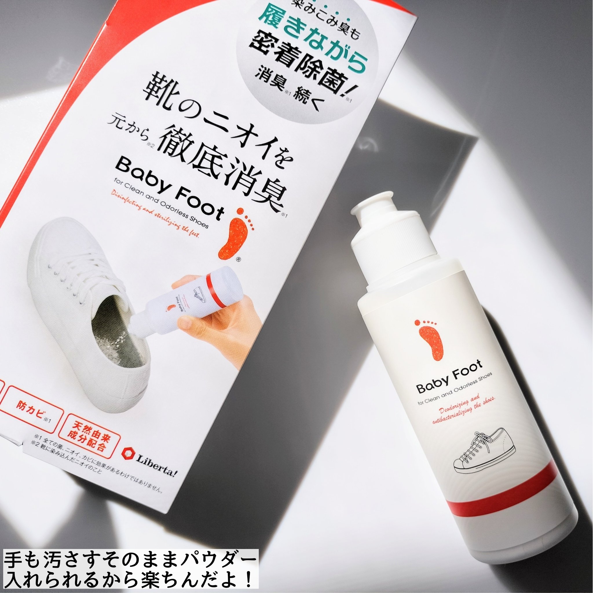 - 靴の中に振りかけて履くだけで靴のニオイ*1を徹底消臭*2できるパウダー。清潔な靴へ、ニオイのもとにアプローチ。 ホタテパウダーの力で繰り返す靴の悪臭*1をストップ*3!洗えない靴にも◎。 *1 イソ吉草酸、酢酸、アンモニアに対して *2 全てのニオイに効果があるわけではありません。 *3 使う度
