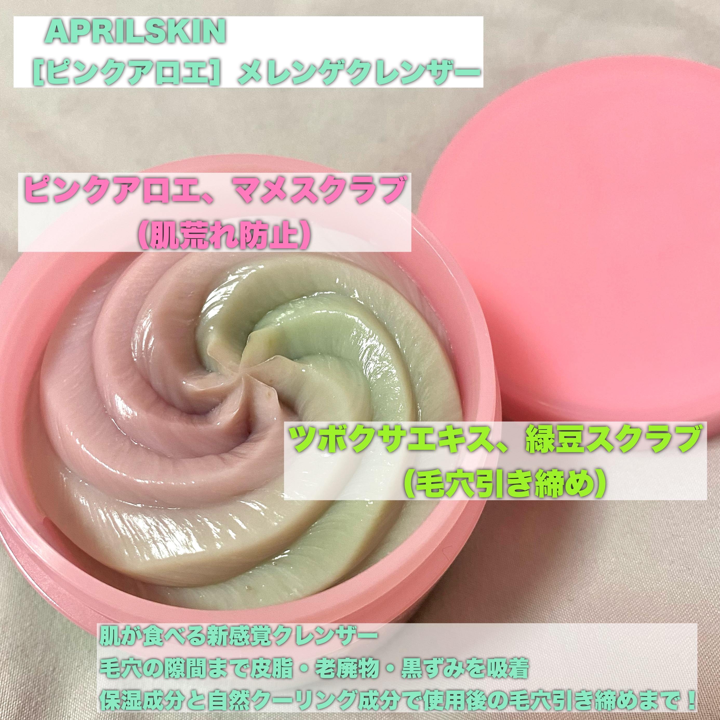 ピンクとアロエ色、またホイップしたような見た目がとっても可愛いです。 テクスチャーはふわふわしっとりなめらか。なめらかに伸びて、優しくなじませることが出来ます。 肌が食べる新感覚メレンゲクレンザー! やわらかい濃度で埋め尽くし、毛穴の隙間まで完璧に皮脂・老廃物・黒ずみを吸着。 保湿成分と自然クーリンク成分で使用後の毛穴引き締めまで。
