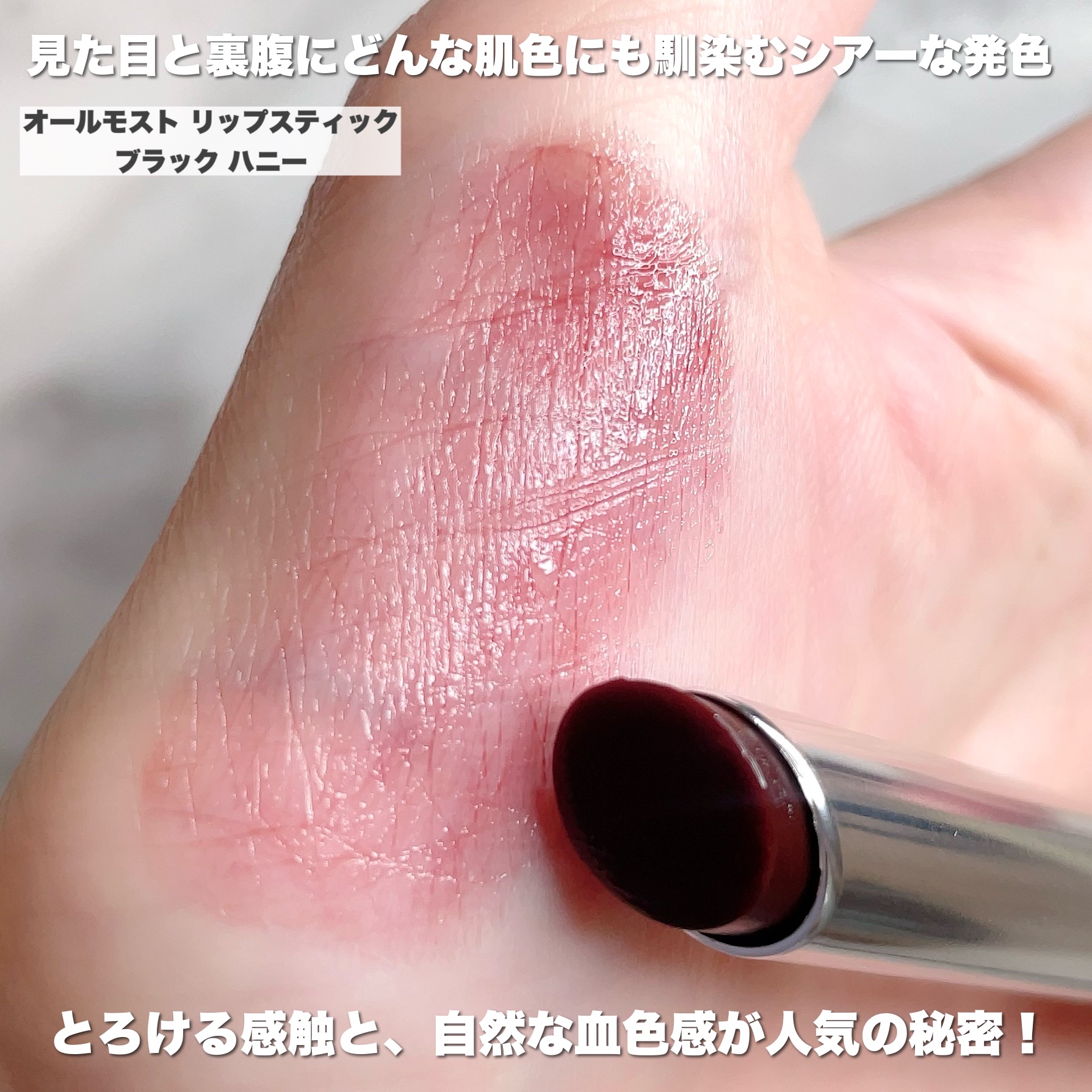 ブラックハニーが誰にでも似合う色だしハチミツのように溶けるから使いやすすぎた… \目線を奪う華やかピンクメイクに/透明感を引き出すチークと血色感リップでホリデイに彩りを どんな肌色や唇にも溶け込むパーソナライズされたようなシアーな仕上がりとハニーのようにとろける感触で人気の「オールモスト リップスティック」