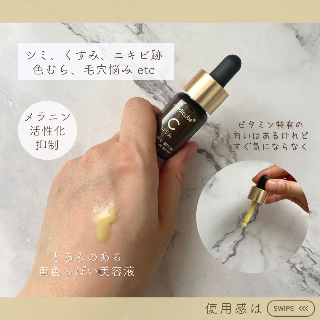 韓国🇰🇷ダーマコスメブランドの[medicube(メディキューブ)]のシミ消しケア。累計100万個販売突破の人気のアイテム! 7日間で肌がトーンアップすることが臨床試験で確認され、美白としわ改善もケアできる美容液✨ とにかく濃い! トロッと濃厚なのがわかります 高濃度ビタミンの証、独特の香りがします