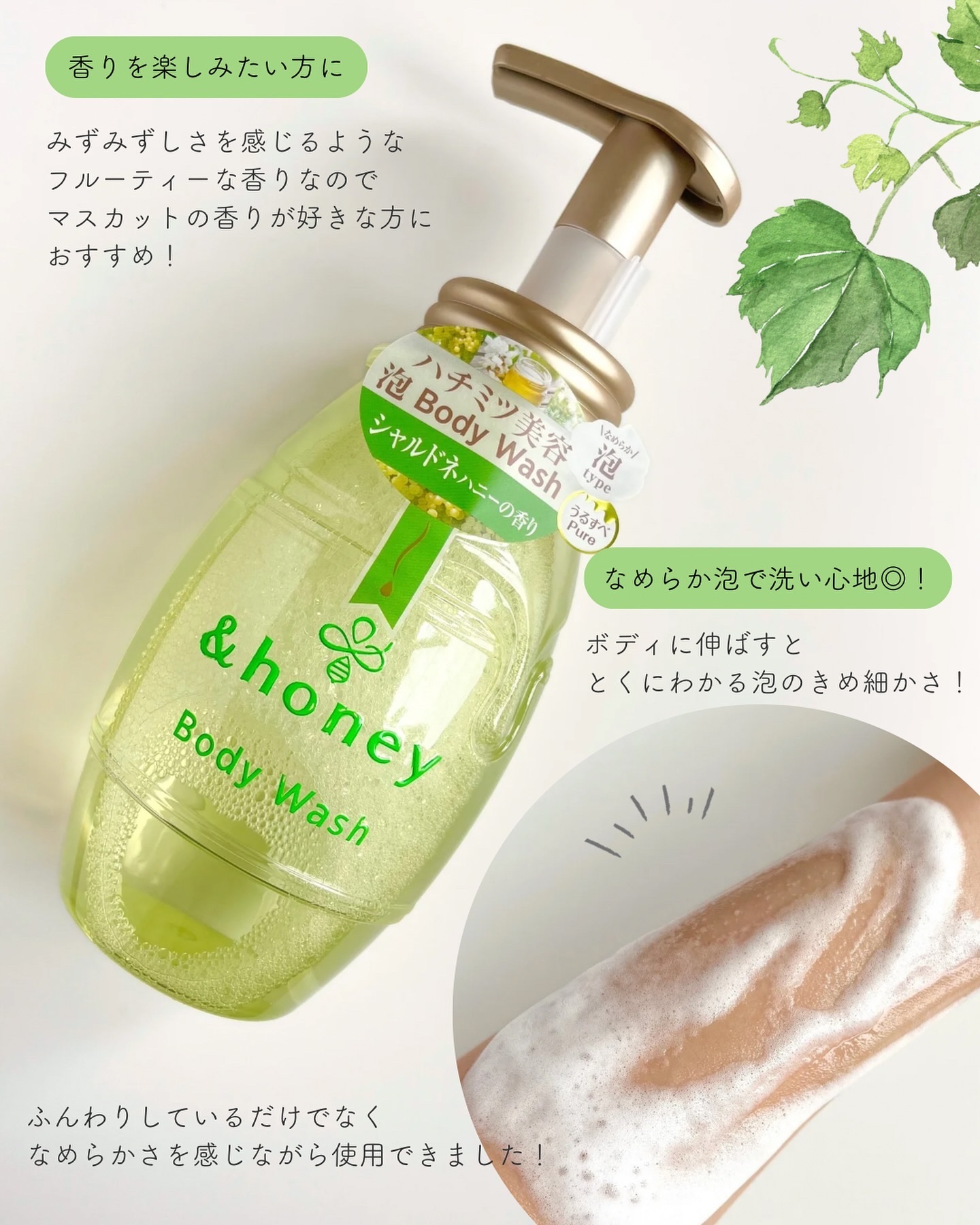 - ハチミツ美容でうるおいを残しながら、 キメ細かくなめらかな泡がやさしくすべすべに洗い上げる泡ボディウォッシュ。 製品の90%以上をハチミツ*1をはじめとして、高保湿ヒアルロン酸*2・アルガンオイル*3などのうるおい成分※1で構成※2し、さらに8つの無添加・フリー処方※3で、「低刺激性処方」を追求しました♡ みずみずしく上品なシャルドネハニーの香りでバスタイムを至福のひとときへ ▼泡ボディがおすすめの方🍯 ○お肌を優しく労わりながら洗いたい方 ○すべすべな仕上がりが好きな方 ○シャルドネの香りが好きな方 サルフェート(ラウレス硫酸Naなど)・鉱物油・アルコール・石油系界面活性剤・ 合成着色料・シリコン・動物実験・防腐剤フリー ※1 保湿・整肌成分の総称 ※2 基剤を除く、水を含む ※3 サルフェート(ラウレス硫酸Naなど)・鉱物油・アルコール・石油系界面活性剤・合成着色料・シリコン・動物実験・防腐剤 *1 保湿 *2 アセチルヒアルロン酸Na(保湿) *3 アルガニアスピノサ核油(保湿)