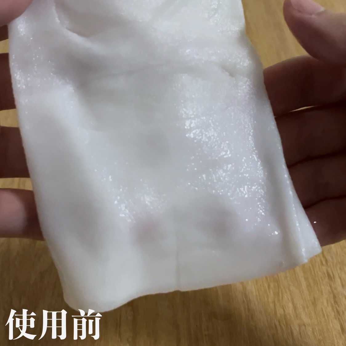 液はジェルのような感じです。 凸凹したシートマスクなので凹部分にジェルがたっぷり入っています。 シートは少し厚めだけど柔らかいので肌に密着してくれます。 シートマスクを外すと肌が液でひったひたでした。 角質ケアできるシート素材になっているので綺麗なお肌の土台作りにも良さそうです。 角質ケアしたあともシートに潤いがあるので身体を拭いて保湿しました。