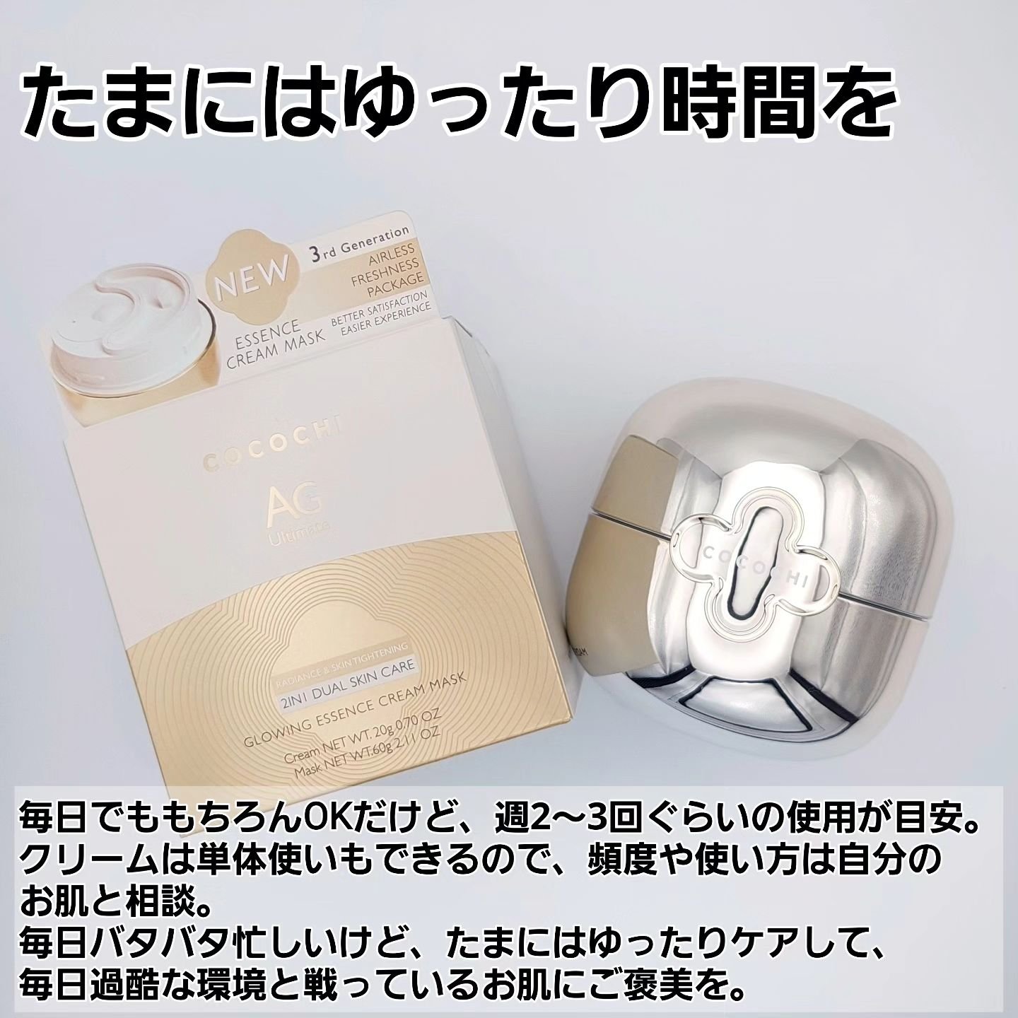 - あなただけの心地よさと向き合うクリームマスク スキンケアも”コスパ、タイパが重宝される時代”。 何もかもが効率よく効果的であることを求められている世の中。 もちろん忙しい毎日に”コスパ”も”タイパ”もありがたい。 でも本当のところは、「それだけではいけない」という気持ちがあったり。 忙しい毎日だからこそ、ときには自分だけの心地よさに包まれて、 自分に向き合い、自分をいつくしみ、健やかなお肌を保つ時間を作り出してみませんか。 COCOCHI グローイング エッセンス クリームマスクは、 2つのステップであなたの心地よさを演出する洗い流すタイプのクリームマスク。 1ステップ目のエッセンスクリームで、肌に潤いに満ちた透明感を与え、 2ステップ目のクリームマスクで、あなたの肌本来の力をサポートし、弾力とハリのあるお肌へ。 15分間のあなただけの心地よい時間。