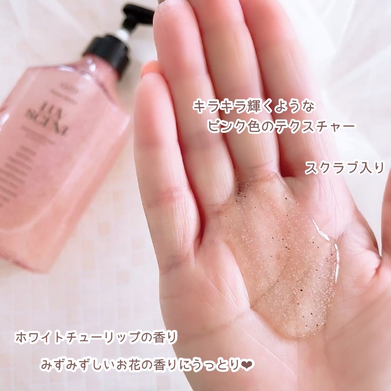 - 優しい使い心地で角質ケアができるパフュームスクラブボディウォッシュです。ココナツの皮やパーライトなど天然のスクラブが優しい使用感で角質をケアします。お肌がうるおい、しっとりもちもち質感の愛され肌へ導きます。泡立てないで直接肌にソープをつけてマッサージすることで、スペシャルケアとしてのゴマージュとしても使用できる2WAYタイプ。 ホワイトチューリップの清らかな香りと繊細で奥深いリーフィーグリーンとベチバーの香り。まるで花屋の真ん中に立っているようなみずみずしさを感じます。