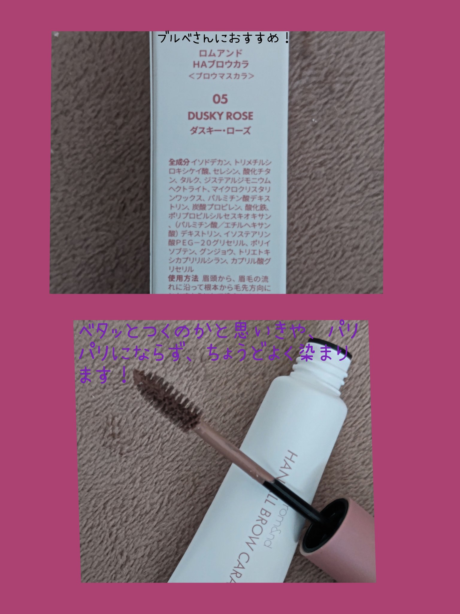 rom&ndハンオールブロウカラ05ダスキー・ローズミニミニサイズで可愛いPlaza825円で購入色は、ほのかなピンクローズベージュ自然な薄眉になるブラシは固めで少し斜めになっている(普通サイズは真っ直ぐだけどね)塗りやすいしだまにもならず良...