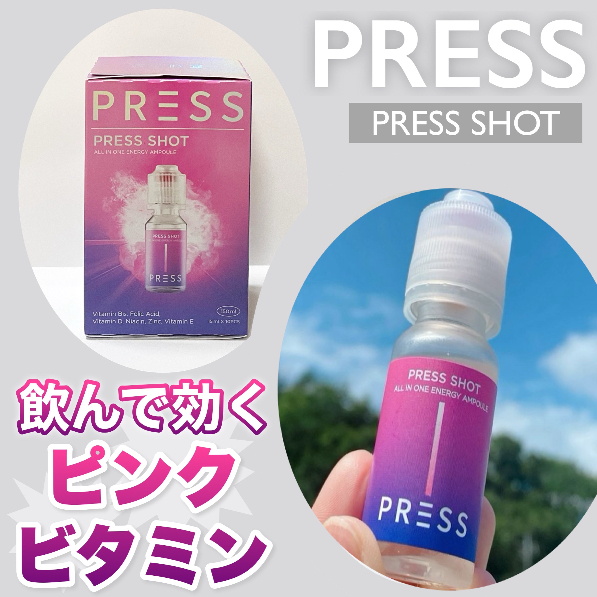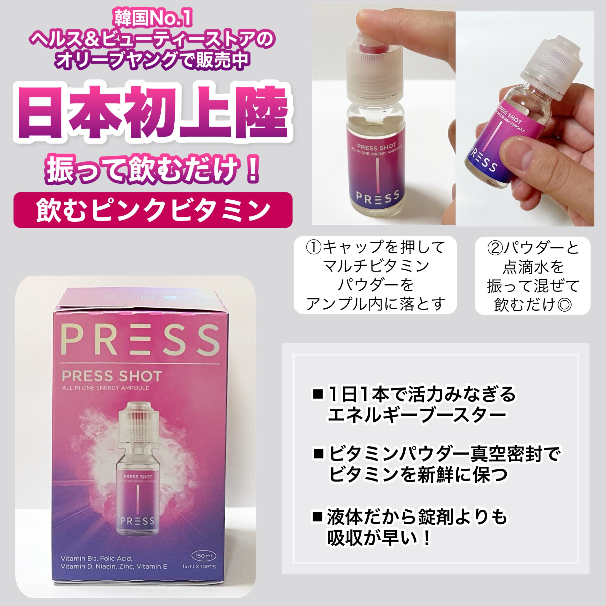 - ・PRESSしてSHAKEするだけ!魔法のようなピンクビタミンに! ・飲むインナービューティー ・飲むピンクビタミン ・粉末にはビタミン B12/D/E、葉酸、ナイアシン、亜鉛が含まれています ・吸収力を重視した液状タイプでの商品設計 ・特許取得の特殊キャップにビタミンを真空密封 ・ビタミンB群を集中配合 ・ビタミンB12は1日の基準値に対し16,667%配合 ・液体は11種類のアミノ酸で吸収しやすい設計 ・飲む瞬間にキャップを押す⇒ビタミンが液体に混ざりフレッシュなビタミンドリンクが完成! 【注意事項】 ・高カルシウム血症がある場合、または医薬品を服用されている方は専門家に相談してください。 ・体に異変を感じた場合は使用を中止し、速やかに専門家に相談してください。 ●本品は、多量摂取により疾病が治癒したり、より健康が増進するものではありません。 亜鉛の摂り過ぎは、銅の吸収を阻害するおそれがありますので、過剰摂取にならないよう注意してください。一日の摂取目安量を守ってください。乳幼児・小児は本品の摂取を避けてください。 ●本品は、特定保健用食品と異なり、消費者庁長官による個別審査を受けたものではありません。 ●食生活は、主食、主菜、副菜を基本に、食事のバランスを。 ●本品製造工場では卵、小麦、そば、落花生、えび、かに、くるみを含む製品を製造しています。 ●摂取目安量:1日当たり1本を目安にお飲みください。 ●摂取の方法:キャップを押すと粉末が落ちます。上下に振り、混ぜてからお飲みください。※粉末が固まる場合がございますが、品質には問題ありません。よく振ってからお飲みください。 2024年12月中旬より全国のウエルシア薬局とロフト※にて先行販売をいたします。 ※一部お取り扱いがない店舗がございます。