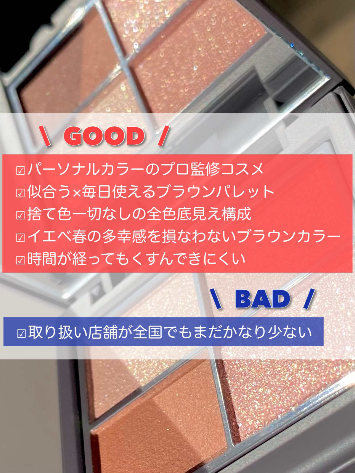 | アイシャドウパレットランキング第8位 | 粉質もパサパサしていないしっとりさらさらの粉質で、ベターザンアイズを持っている方なら想像のつくあのサラサラ感です | 詳細を見る | |