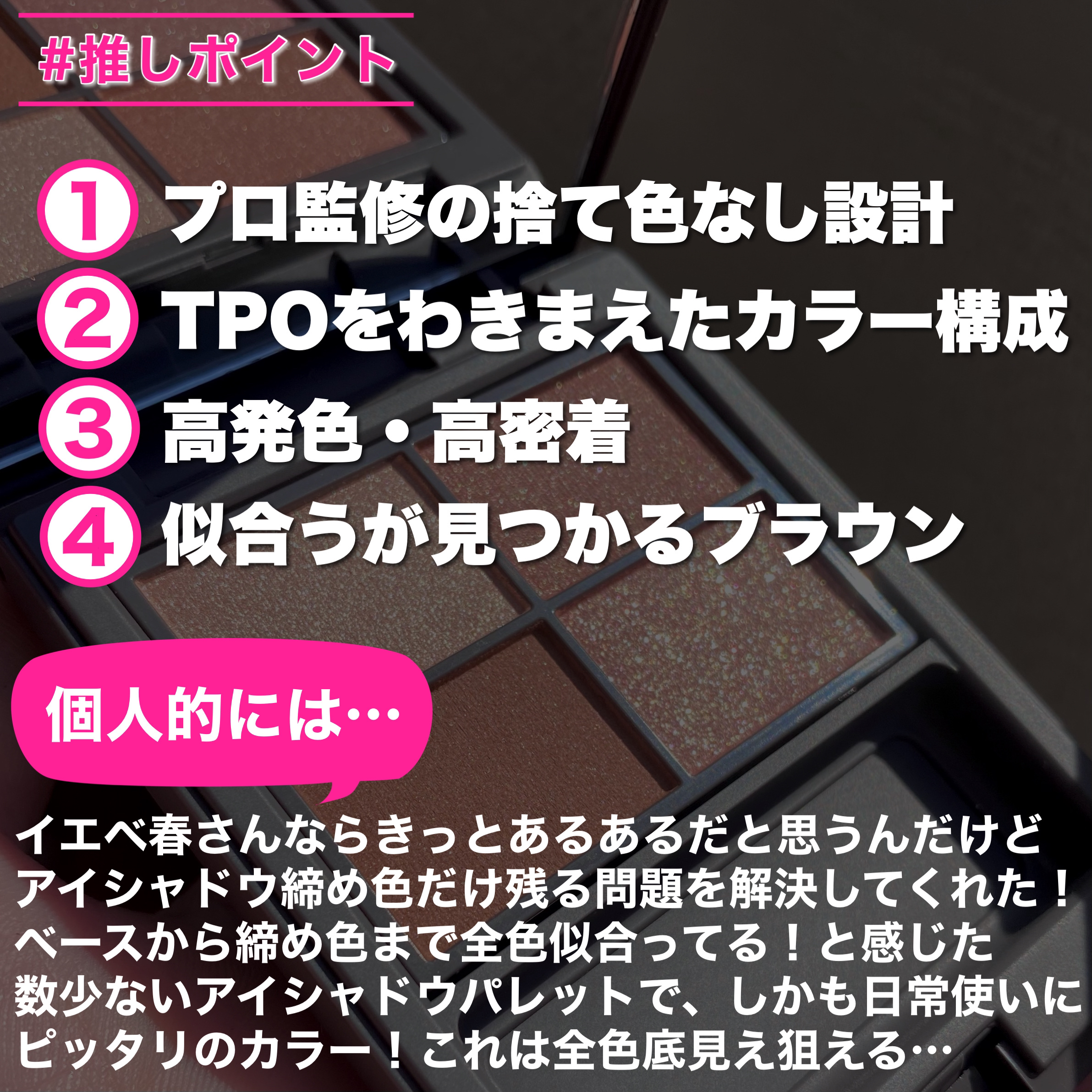 | アイシャドウパレットランキング第1位 | とにかくテクスチャーの質の良さが光る逸品…!!✨瞼にスッと溶け込むというか、粉がかなり軽やか。 | 詳細を見る | ||