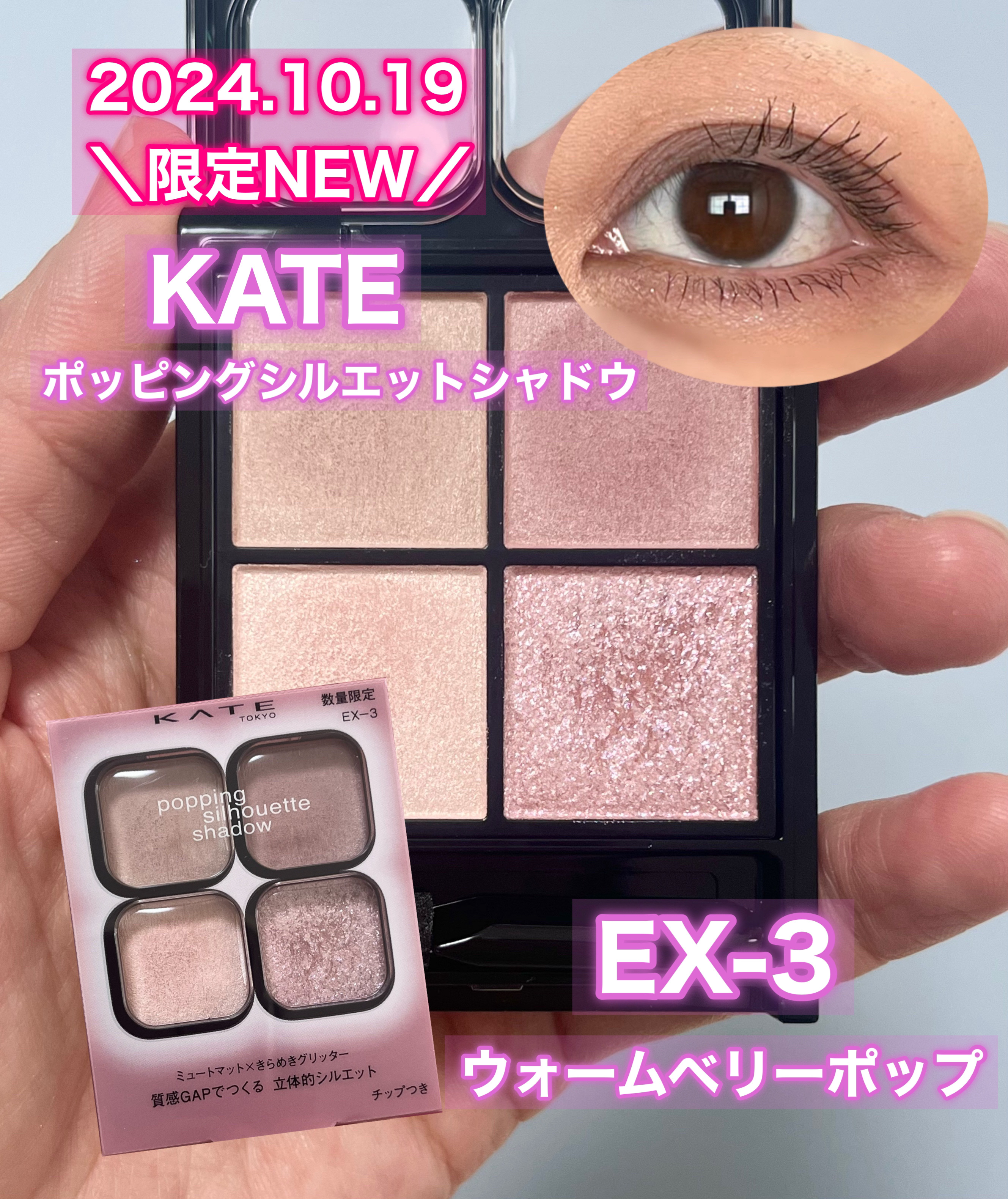 \2024.10.19NEW/KATEポッピングシルエットシャドウEX-3ウォームベリーポップ限定¥1,540マツキヨで、まだ店頭に並んでいませんでしたが、聞いてみたら買えました💓内パケは既存と同じ黒パケ💡外パケが可愛い😍とりあえずスウォッチ...