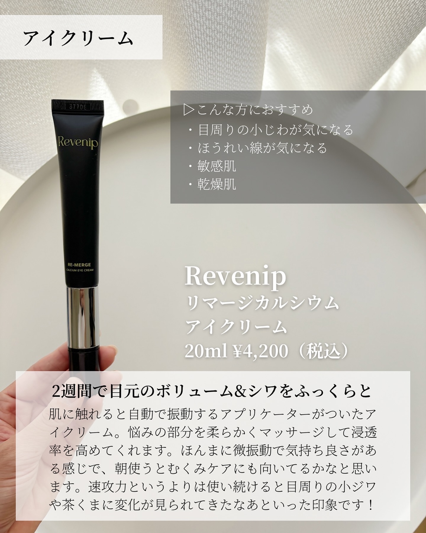 カルシウム 633,410 PPM配合 目元の弾力、ボリュームアップ 振動デバイスが付いている金属部分を持つと電源ON 毎分12000回のマイクロ音波振動で吸収力をさらにアップ