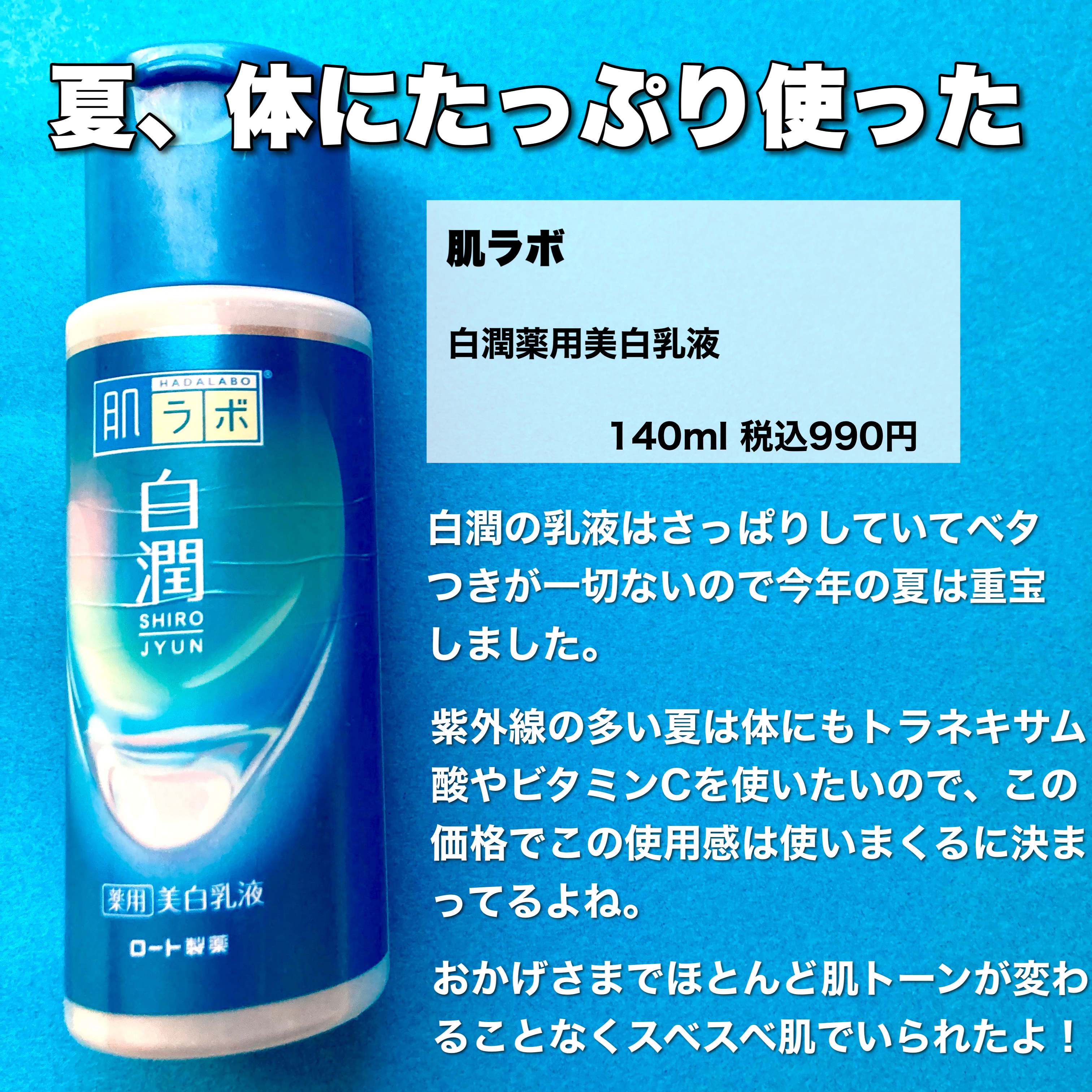 白潤 薬用美白乳液のほうなんです。 白潤の乳液を体に使い始めてからとにかく体がふかふかスベスベでもう病みつき。 ベタつかないから割とすぐ服を着られるし快適でしかない!