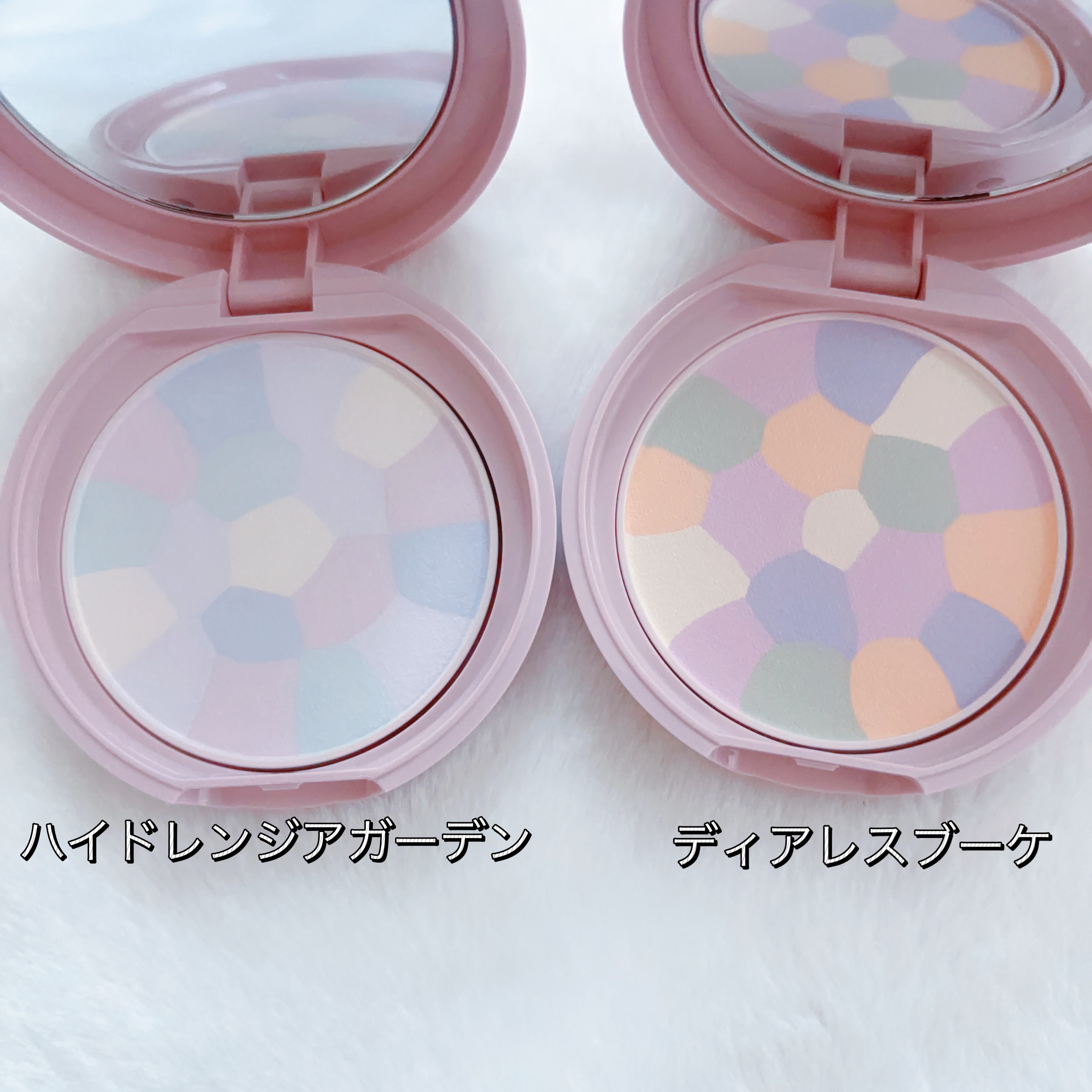 イルミネイティングフィニッシュパウダー~Abloom~は現在01ハイドレンジアガーデンのみの色展開。 このパウダーは、繊細なパールが配合されていて自然なツヤ感をあたえてくれます。 そしてパケもめっちゃかわいいのー!!何歳になってもこういうデザイン好きよ🥰ときめく🥰