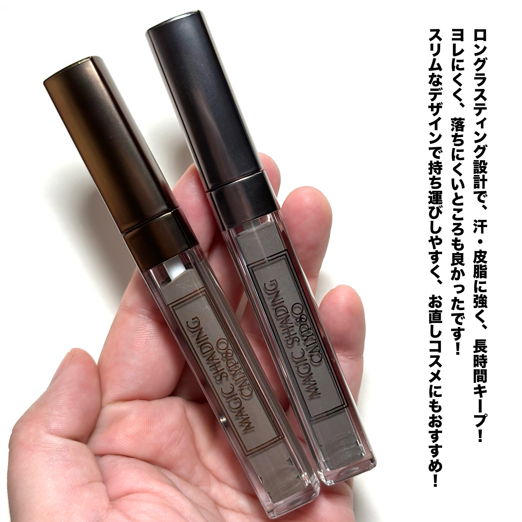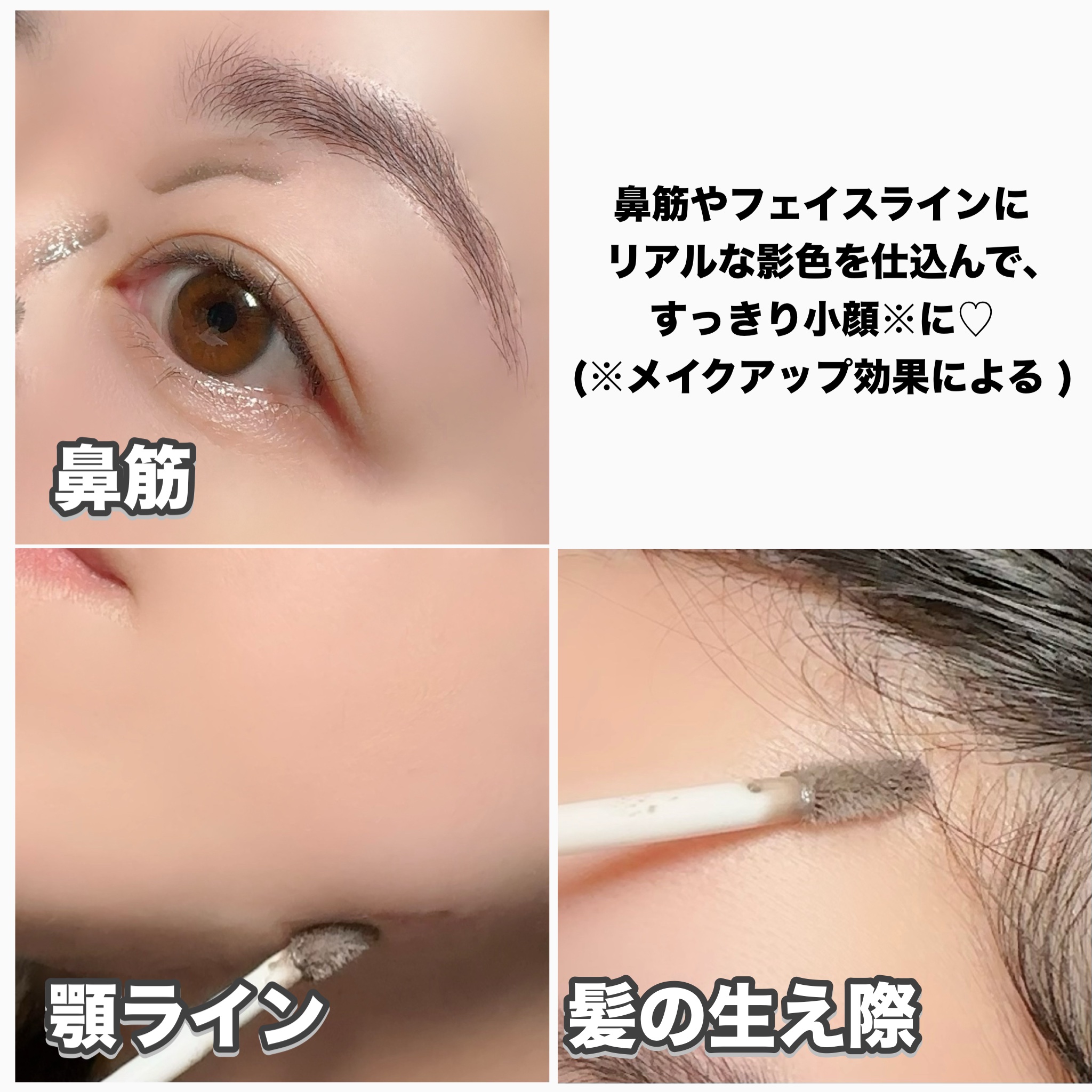 - ■リキッドタイプだから叶えられる高発色 影を作りたいところにしっかり発色。 リキッドなので粉飛びすることや厚塗り感も出にくく、はっきりした影もふんわりした影も思いのままに仕込めます。 ■肌色に溶け込む色味で【リアルな影色】が仕込める 透け感のあるシアーな質感とグレージュカラーで自然な影色を表現。近距離で見られても◎! ■立体感を作り出す【ツヤ影】が仕込める 光拡散効果のある真球状パウダー(*1)と光沢感の高い鱗片状パウダー配合し、ツヤ感のある影(ツヤ影)を実現 ■ロングラスティング設計で長時間、自然な影をキープ 皮脂吸着パウダー(*2)と柔軟性の高い皮膜材(*3)を配合だから、汗、皮脂に強く、長時間キープ。 *1(HDI/トリメチロールヘキシルラクトン)クロスポリマー(基剤) *2 炭酸Ca(基剤) *3 トリメチルシロキシケイ酸(被膜形成剤)