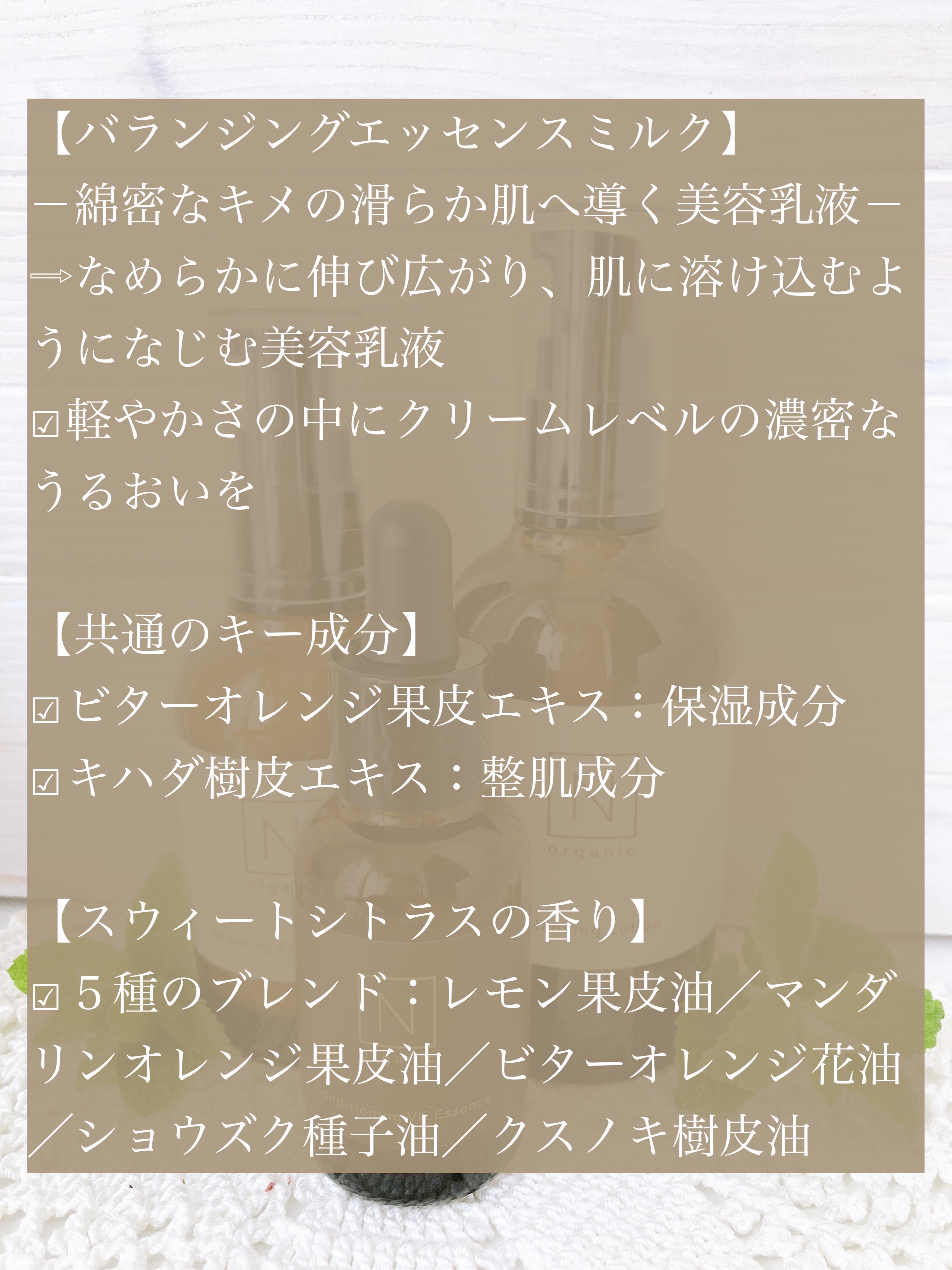 モイスチュア&バランシング ローションは若干とろみがあって、肌をしっとり仕上げてくれる✨ 爽やかな柑橘系の精油の香りも⭕️🍊 N organicって香りもいいから使ってて楽しいよね。 しっかりとした保湿感で、乾燥が気になる頬やフェイスラインもしっとり♡