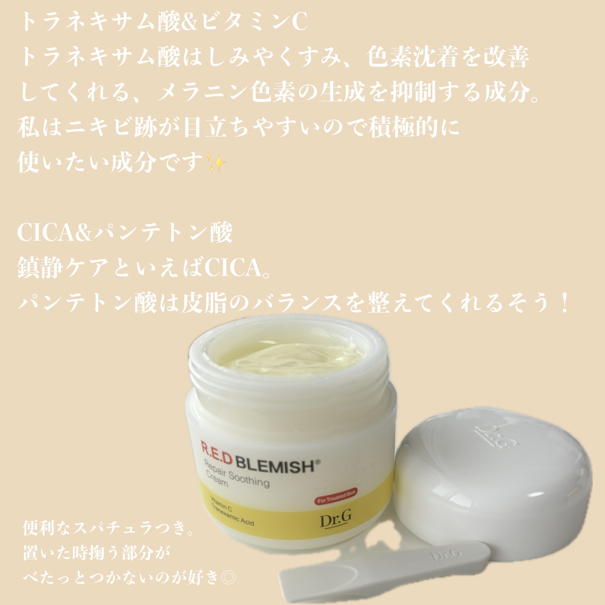 Dr.Gレッドブレミッシュリペアスージングクリーム鎮静とかメラニンの生成を抑えたりとか肌トラブルから守ってくれる系の成分が含まれてるクリーム!トラネキサム酸、シカ、パンテトン酸、ビタミンC、ナイアシンアミドなどが入ってる!このクリームもベタつ...