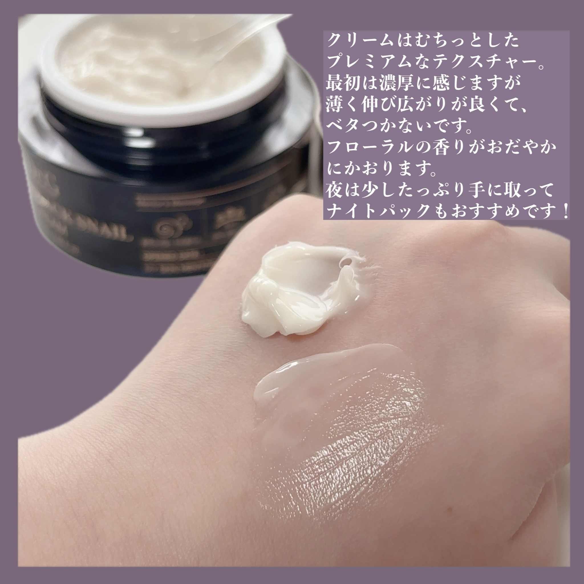 - 保湿だけでなく、透明感*1、ハリ、弾力のケアまでできる、クリームです。 ブラックスネイル*2を20%配合し、さらにブラックプロポリス*2を配合しているので、エイジングケア*3に必要な潤いをしっかりと肌に与え、もっちりと潤ったお肌に導きます。ナイアシンアミド*2やツボクサエキス*2なども含まれているので、様々な保湿ケアに対応できるため、肌の健やかさを保つことができます。 *1艶やかな肌印象のこと *2整肌成分 *3年齢に応じたお手入れ