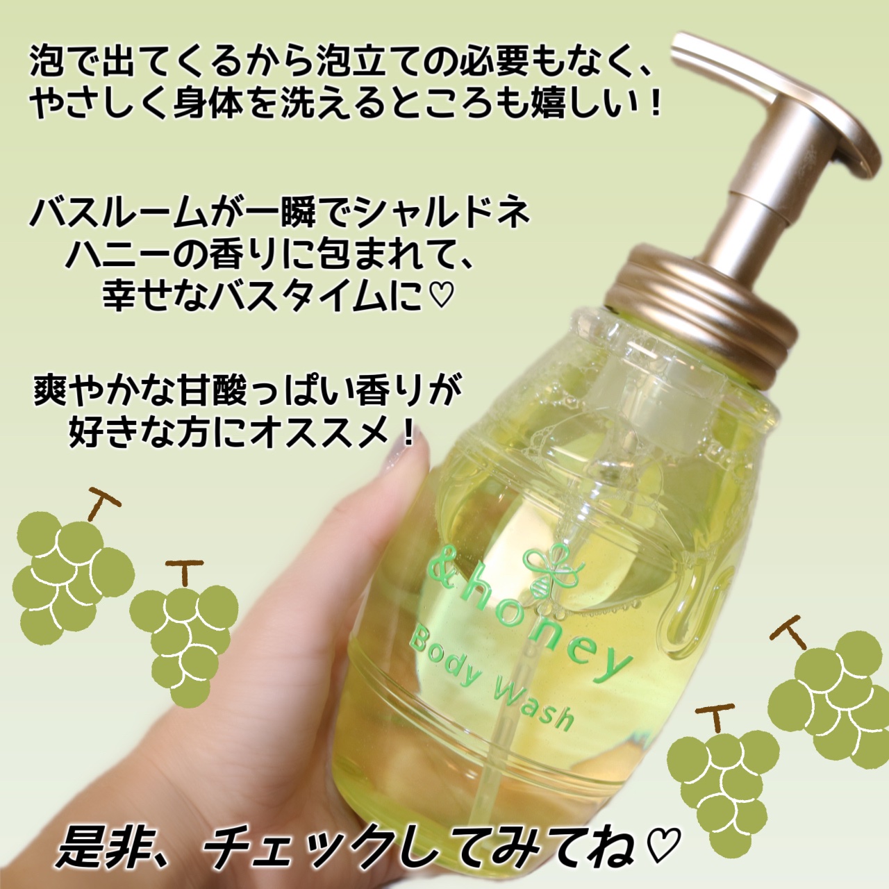 優しい洗い心地でうるすべ肌が叶う とろけるハニー泡*1処方で、潤いながらもすべすべな仕上がりへ導いてくれます! 特に個人的に良かったのは香り。みずみずしく芳醇なシャルドネの香りで、洗っている時はもちろん、洗い流した後もふわ〜っと残っていました! パッケージがおしゃれだからお風呂場に置いてあるだけでもテンションが上がりますっ🥂