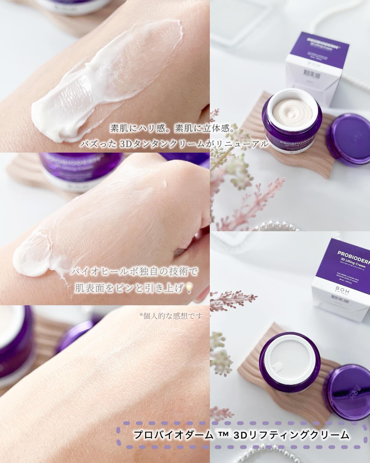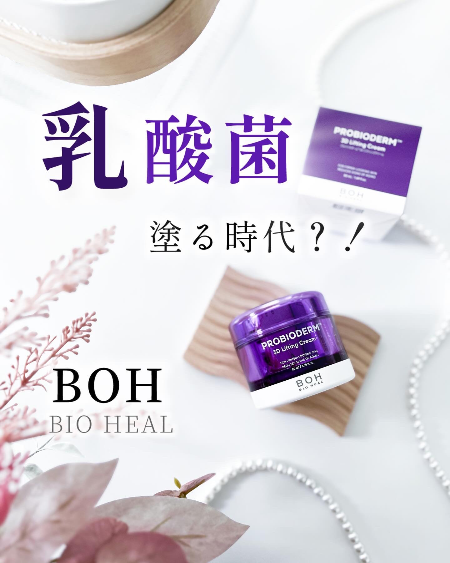 - プロバイオダーム™ 3D リフティングクリーム ・既存のタンタンクリームが、より一層のハリ弾力ケアができる商品としてパワーアップ※! ★プロバイオダーム™ 3Dリフティングクリームリニューアルポイント★ ①BIOHEAL BOHが厳選した乳酸菌*のみ配合した独自保湿成分!「プロバイオダーム™」 BIOHEAL BOHの厳しい審査のもとに選び抜かれた肌バリアをサポートする独自の乳酸菌*でハリ弾力ケアを! →キーワード #ハリ活乳酸菌 *厳選した乳酸菌:ラクトバチルスプランタラム&ラクトバチルスラムノサス&ラクトバチルスロイテリ(全て保湿) ②肌本来の弾力維持に欠かせない成分をプラス!肌が持つ成分を補うことで、ふっくらうるおった肌のハリ感をキープ ③ペプチドが12種から17種に!肌バリアを形成。素肌をすこやかに保ちます。 ・もちっと密度の高いクリームで保湿&ハリケア。 バイオヒールボ独自の技術で肌表面をピンとハリをあたえ、よりハリ感が得られるテクスチャーを実現 ・3Dと訴求しているように、ふっくらうるおい感のある多面的な弾力ケアができることから、韓国語でしっかりハリのある様子を表現するタンタン(탄탄)のワードと組み合わせて「3Dタンタンシクリーム」という愛称ができました。 ・もちっと密度の高いクリームで弾力のある素肌に導くエイジングケア※2クリーム。 ※同商品リニューアル前に比べて ※2年齢に応じたケアの事