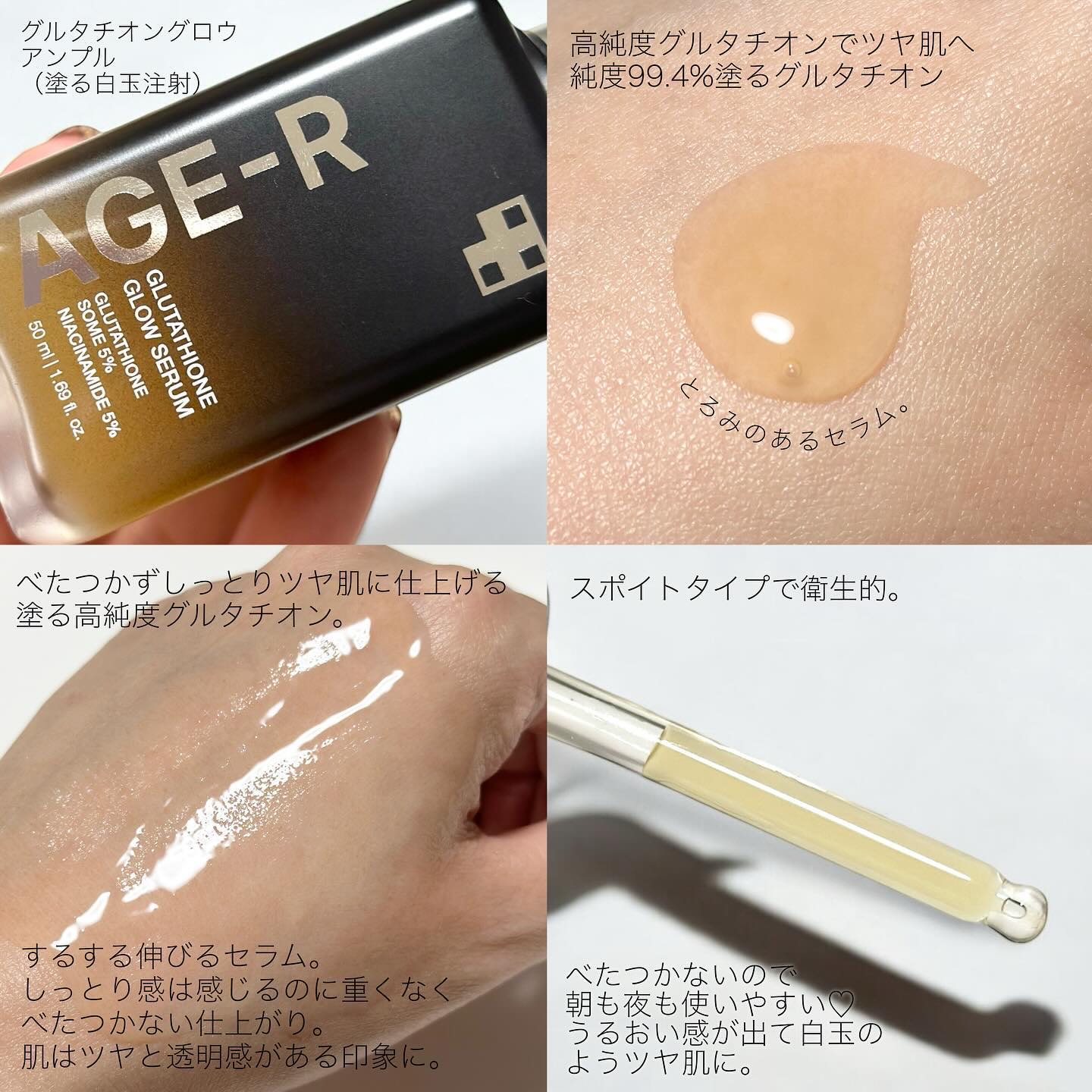 - 高純度99.4%のグルタチオン*を配合し、ハリツヤ肌に導く美容液です。 肌に馴染みやすいリン脂質製のカプセルにグルタチオン成分*を閉じ込め、肌の角質層までうるおいで満たします。 ☑グルタチオンソーム*:50,000ppm ☑ナイアシンアミド* 5%配合 ☑べたつかずしっとりツヤ肌 ☑美顔器AGE-R スキンブースターショットと一緒に使えます 化粧水などでお肌を整えたあと、適量を取り、お肌のキメに沿ってまんべんなく塗った後、やさしくなじませます。 *保湿成分 ■お肌に異常が生じていないかよく注意してご使用ください。化粧品がお肌に合わないとき即ち次のような場合には、使用を中止してください。そのまま使 用を続けますと、症状を悪化させることがありますので、皮膚科専門医等にご相談されることをおすすめします。また、傷やはれもの、しっしん等の異常が ある部位には、ご使用にならないでください。 (1)使用中、赤味、はれ、かゆみ、刺激、色抜け(白斑等)や黒ずみ等の異常があらわれた場合 (2)使用したお肌に、直射日光があたって上記のような異常があらわれた場合 ■目に入らないようご注意ください。目に入ったときは、こすらずにすぐに洗い流してください。その後、目に異物感など異常が残る場合は、眼科専門医へ ご相談されることをおすすめします。 ■極端に高温又は低温の場所、直射日光のあたる場所には保管しないでください。 ■開封後なるべく早めに使用してください。 ■ご使用後はフタをきちんと閉めてください。 ■乳児、子供の手の届かない所に保管してください。